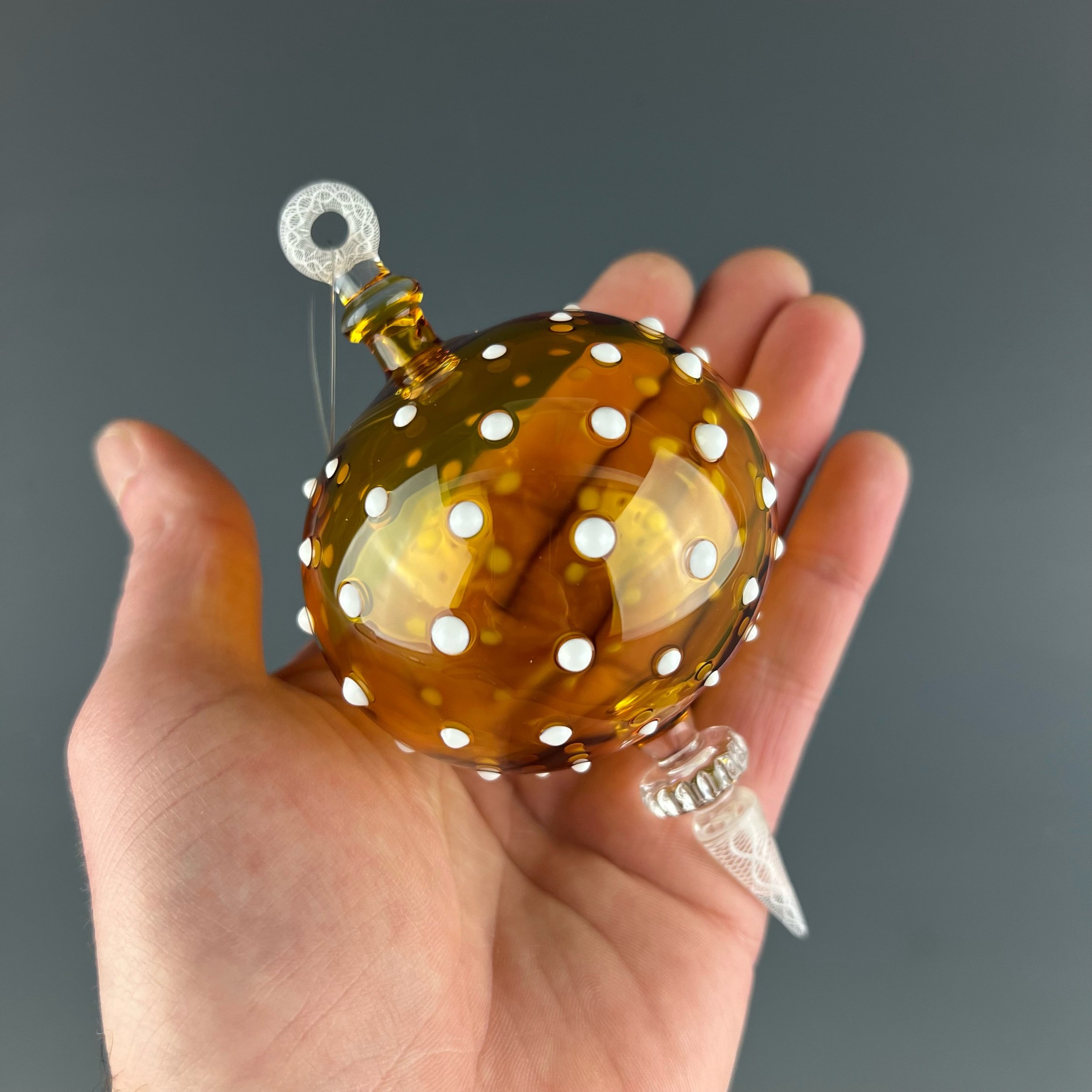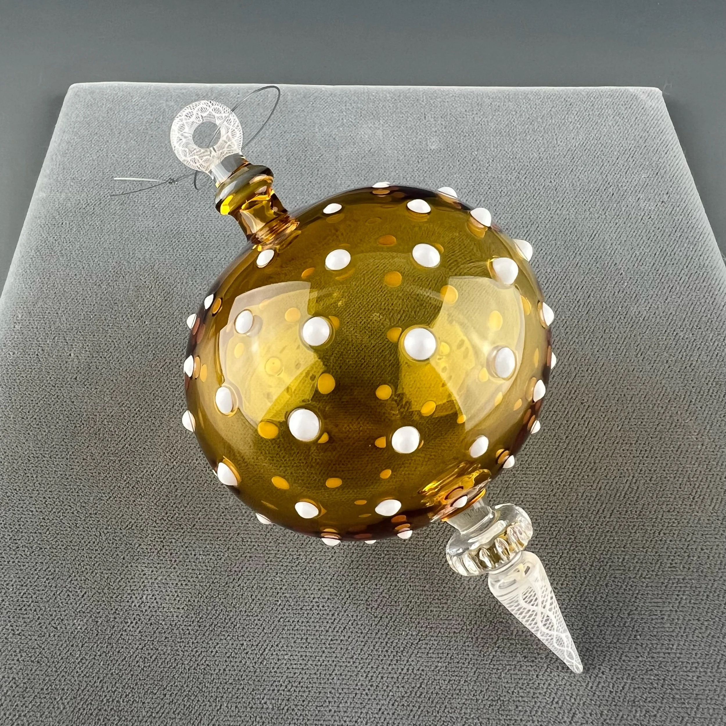 This nice hanging ornament is made with crisp transparent topaz glass, decorated with a raised dot matrix pattern in enamel white. Finished with clear and white latticino helix cane elements.
