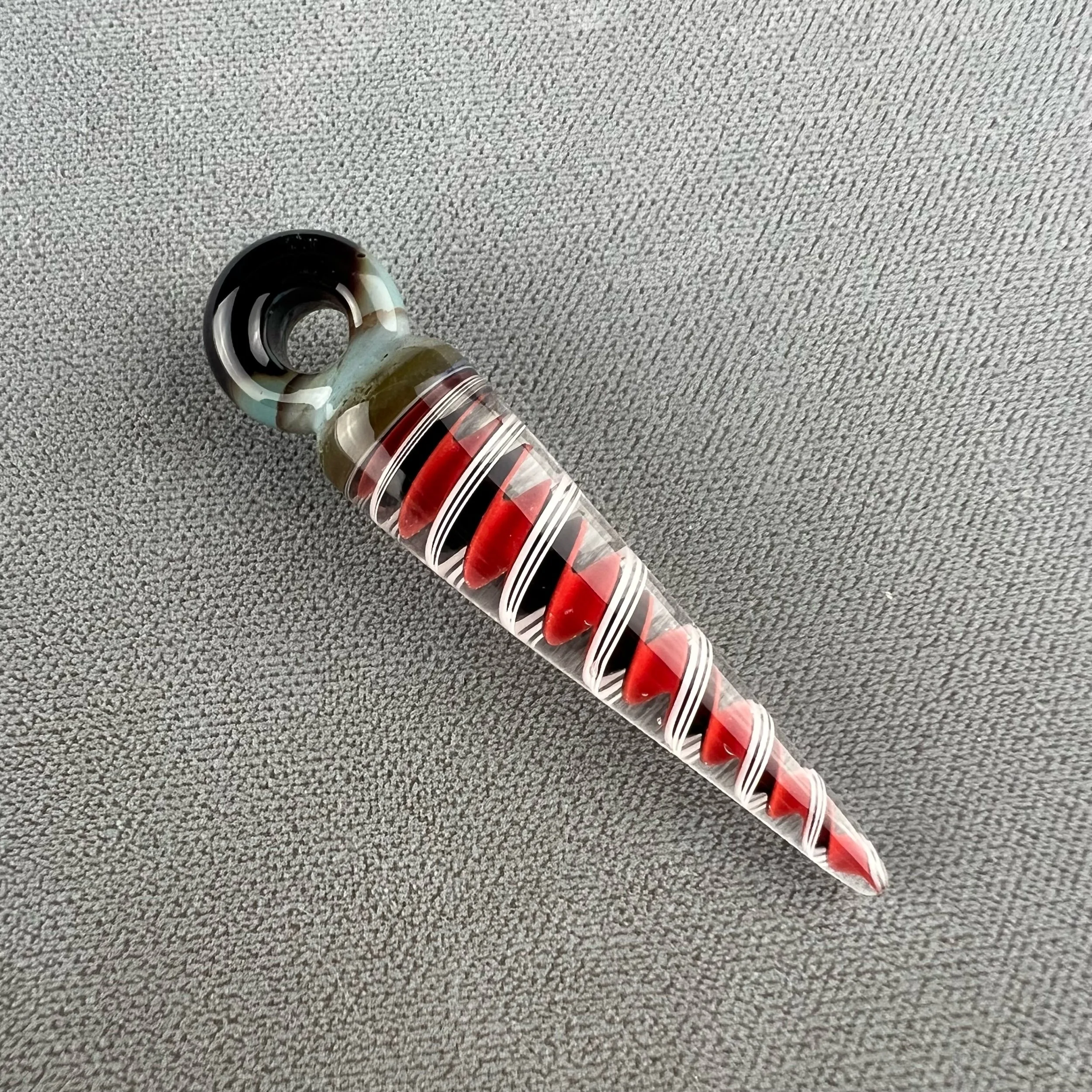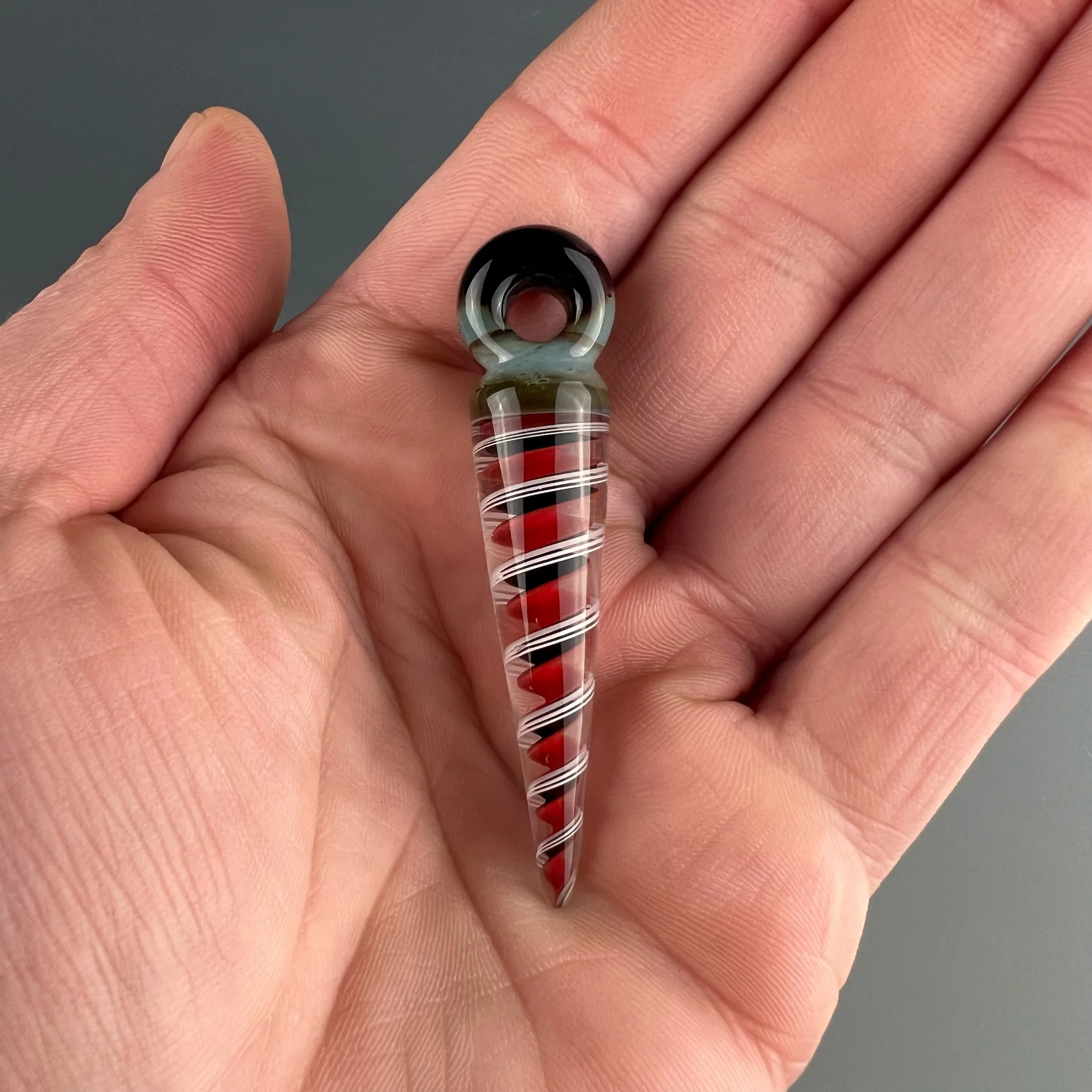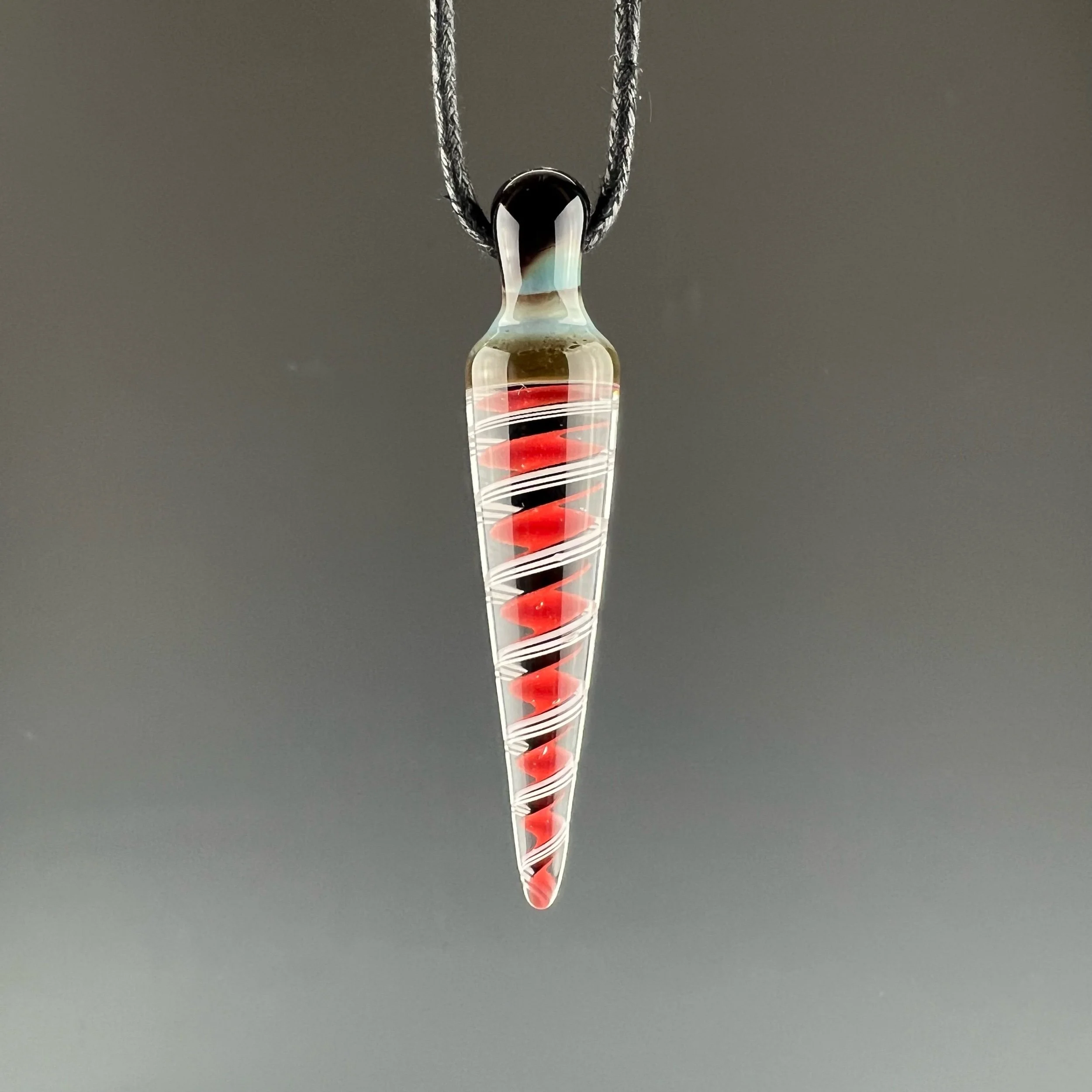 A tapered pendulum pendant. Made with cherry/black ribbon cane with white lines, finished with a dark variegated bail.
