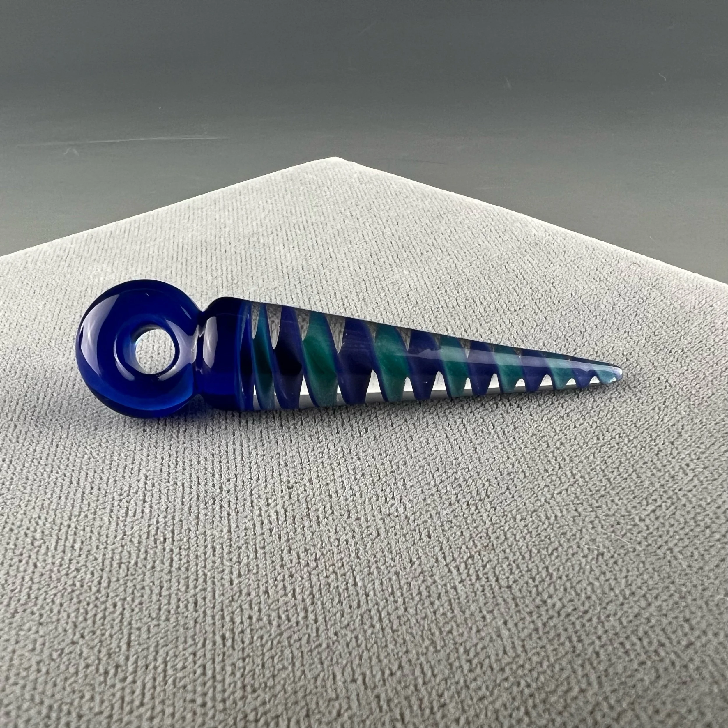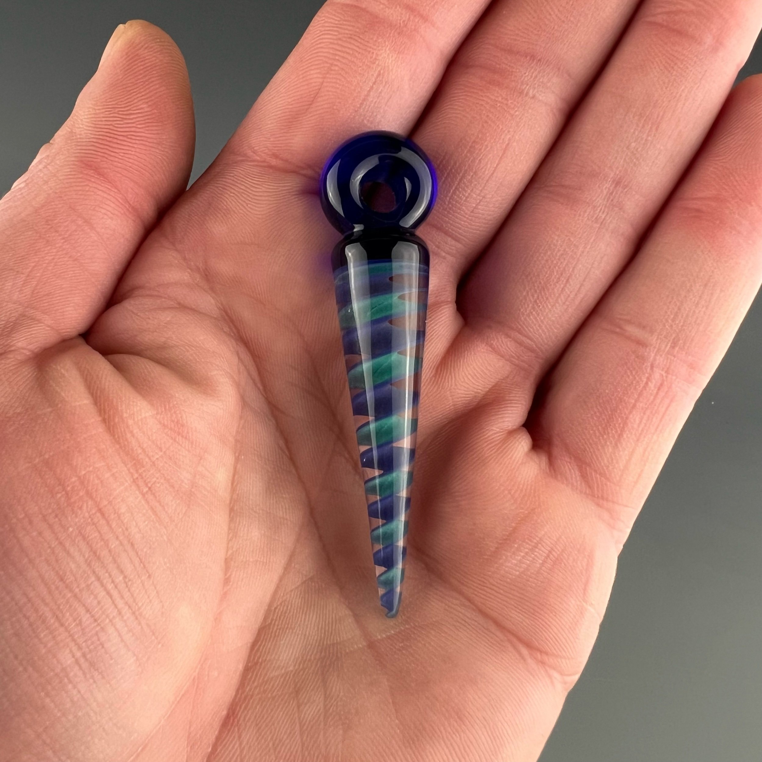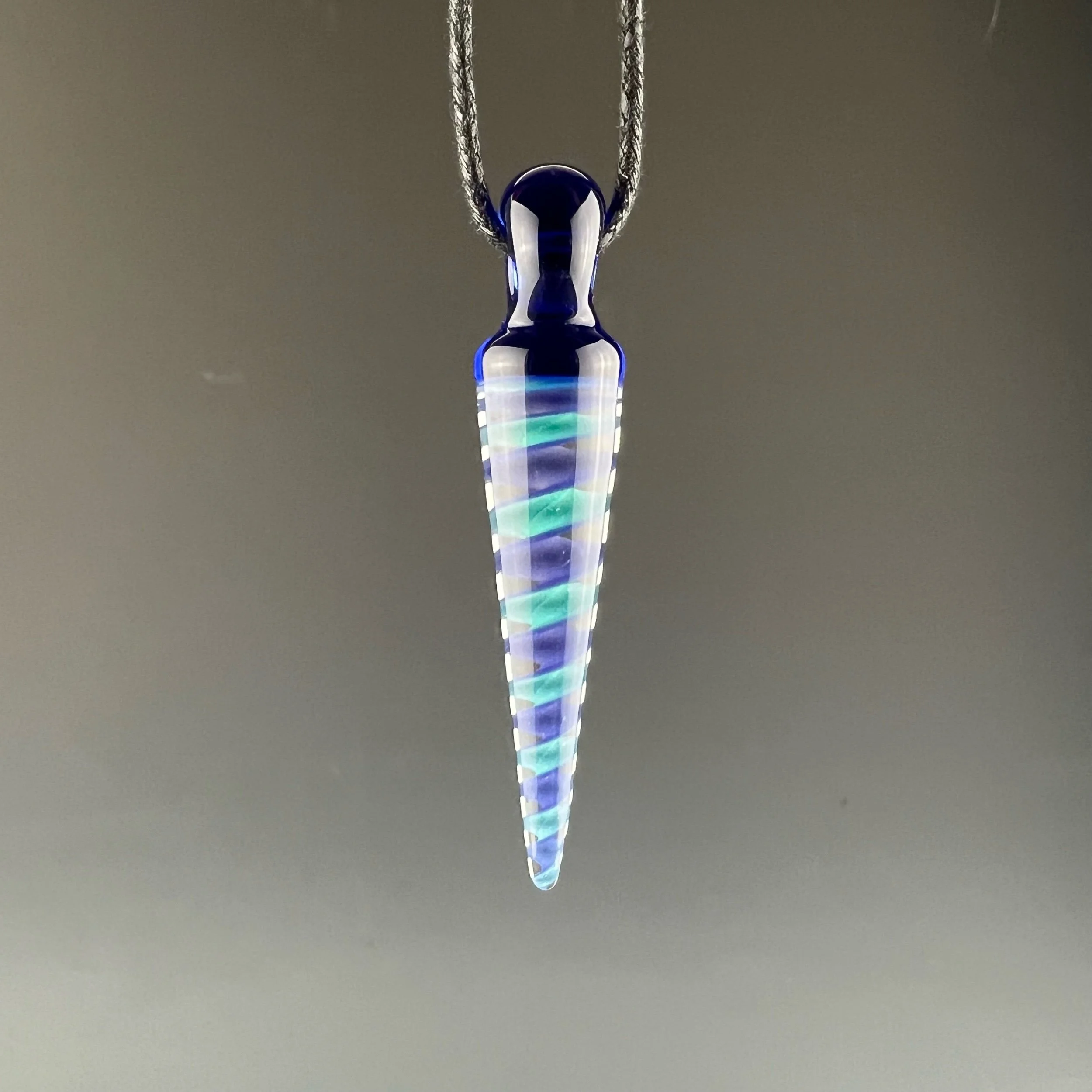 A nice pendulum pendant made with teal/violet ribbon cane, finished with cobalt blue bail.
