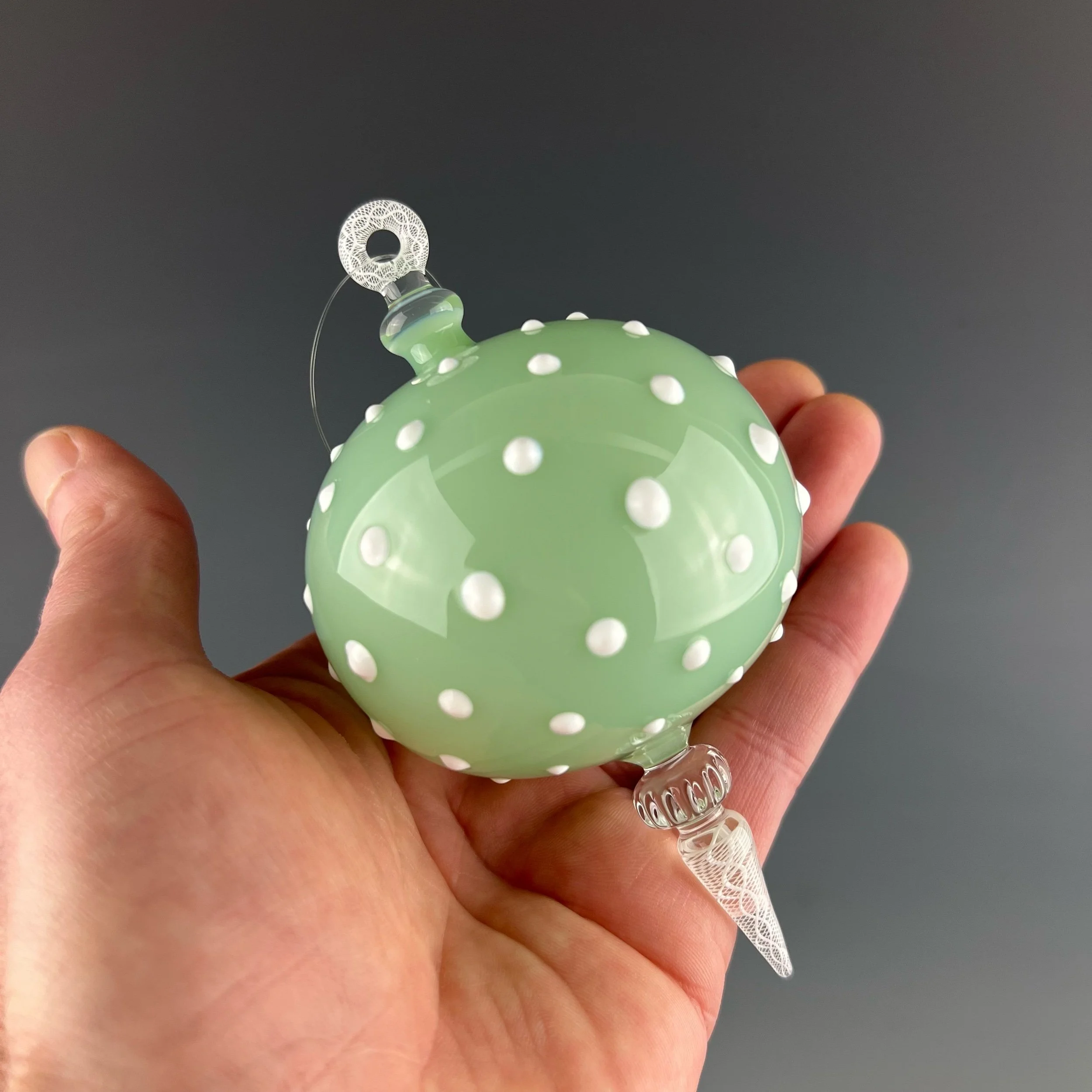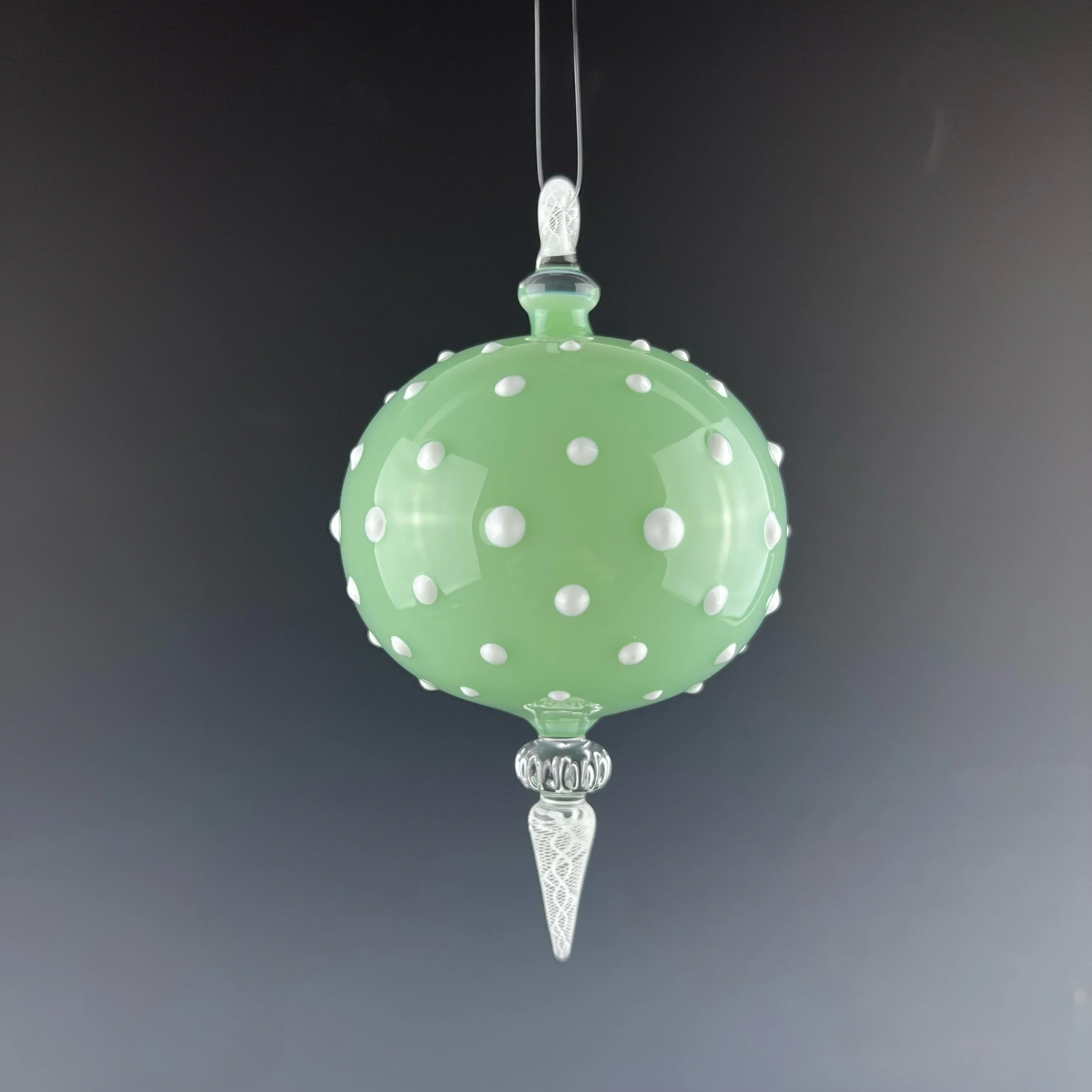 This nice hanging ornament is made with jade green glass, decorated with a raised dot matrix pattern in enamel white. Finished with clear and white latticino helix cane elements.