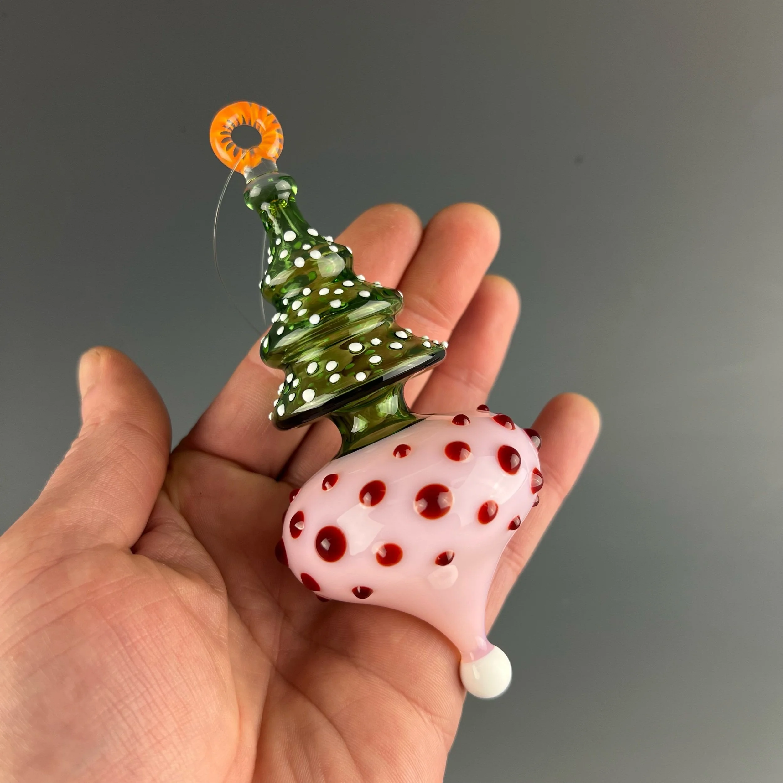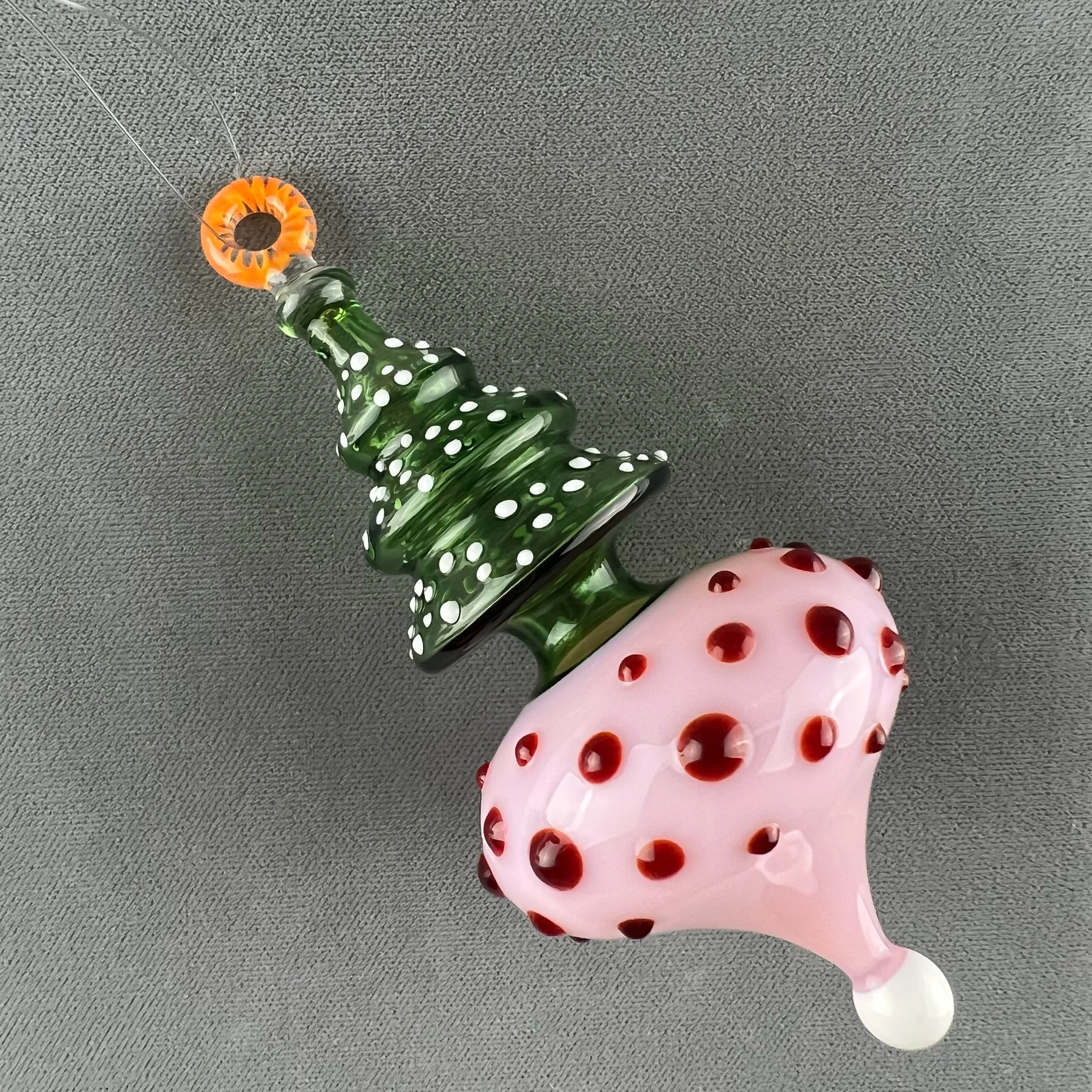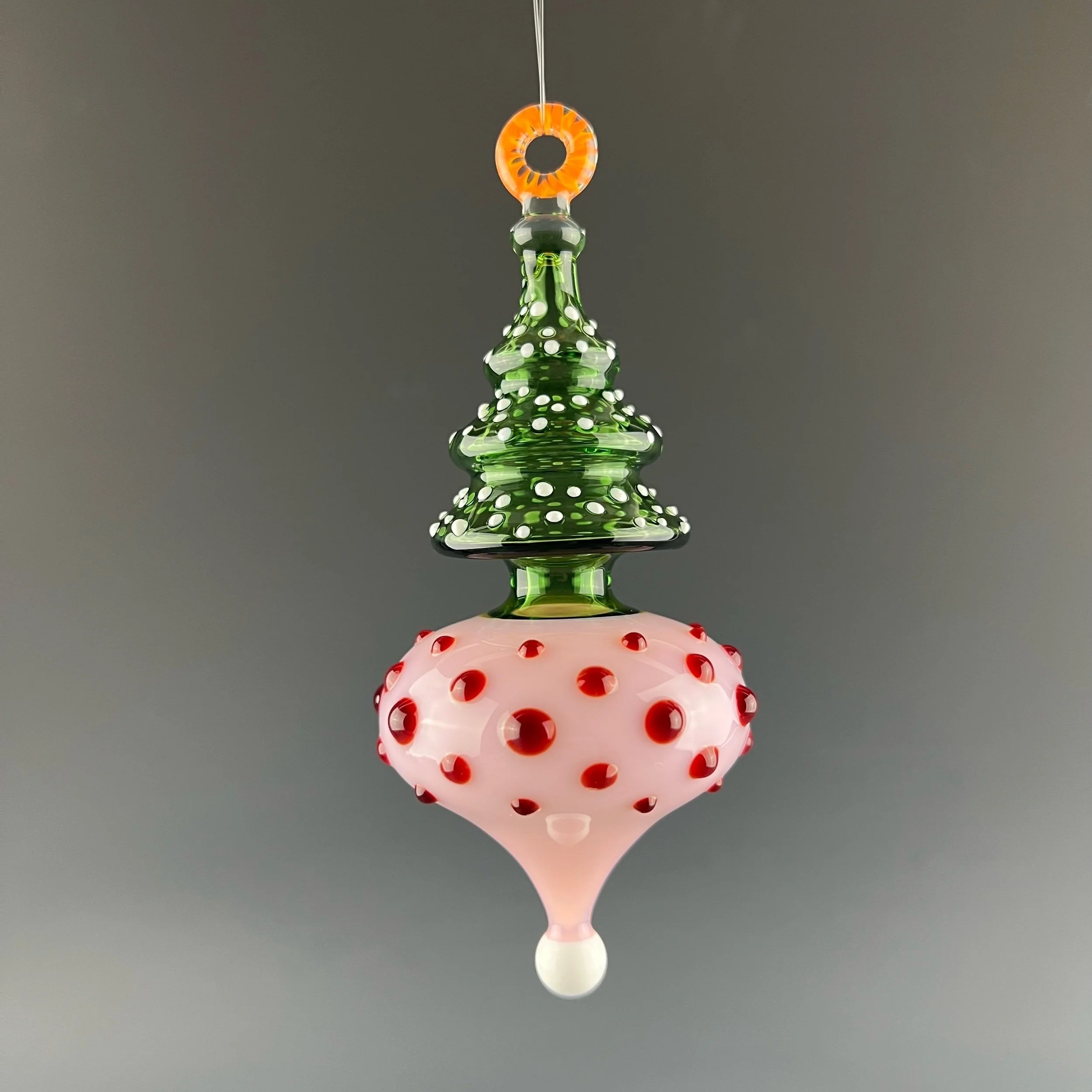 This nice and shapely hanging ornament has a pastel pink lower section decorated with ruby-red hobnails, topped with a tiered tree in transparent emerald green, sprinkled with snowy white dots. Finished with a yellow/orange cane “Sun” loop.