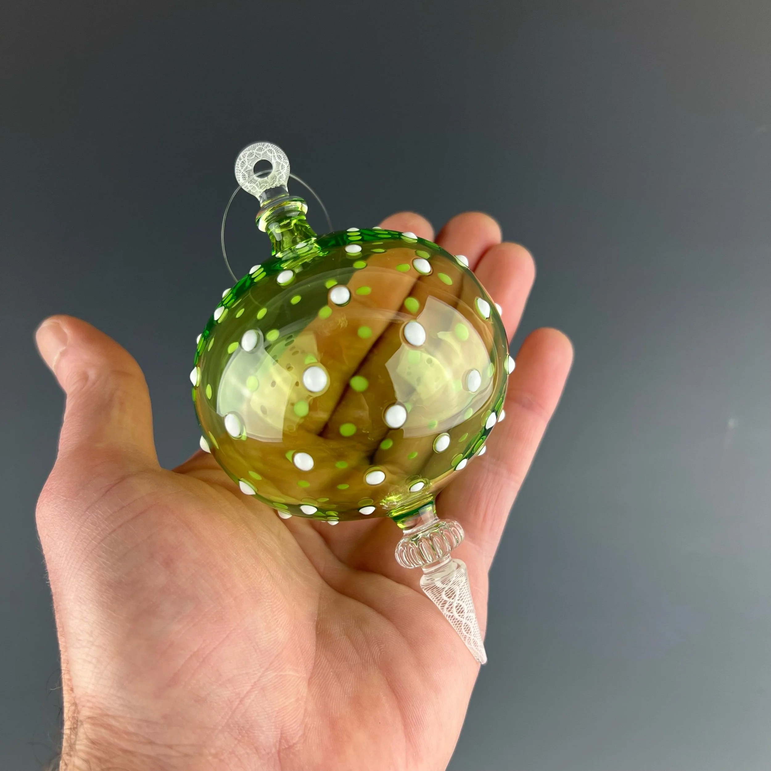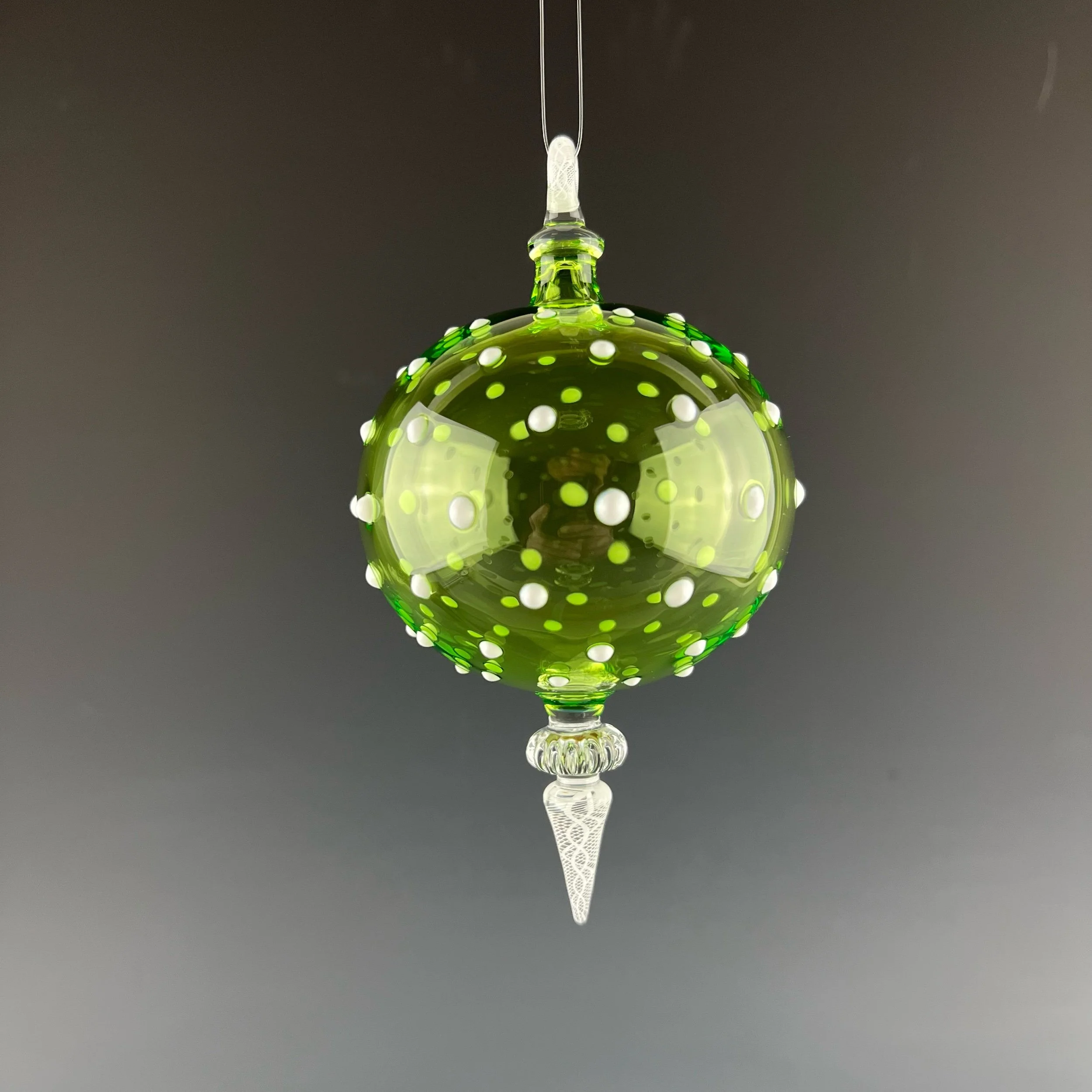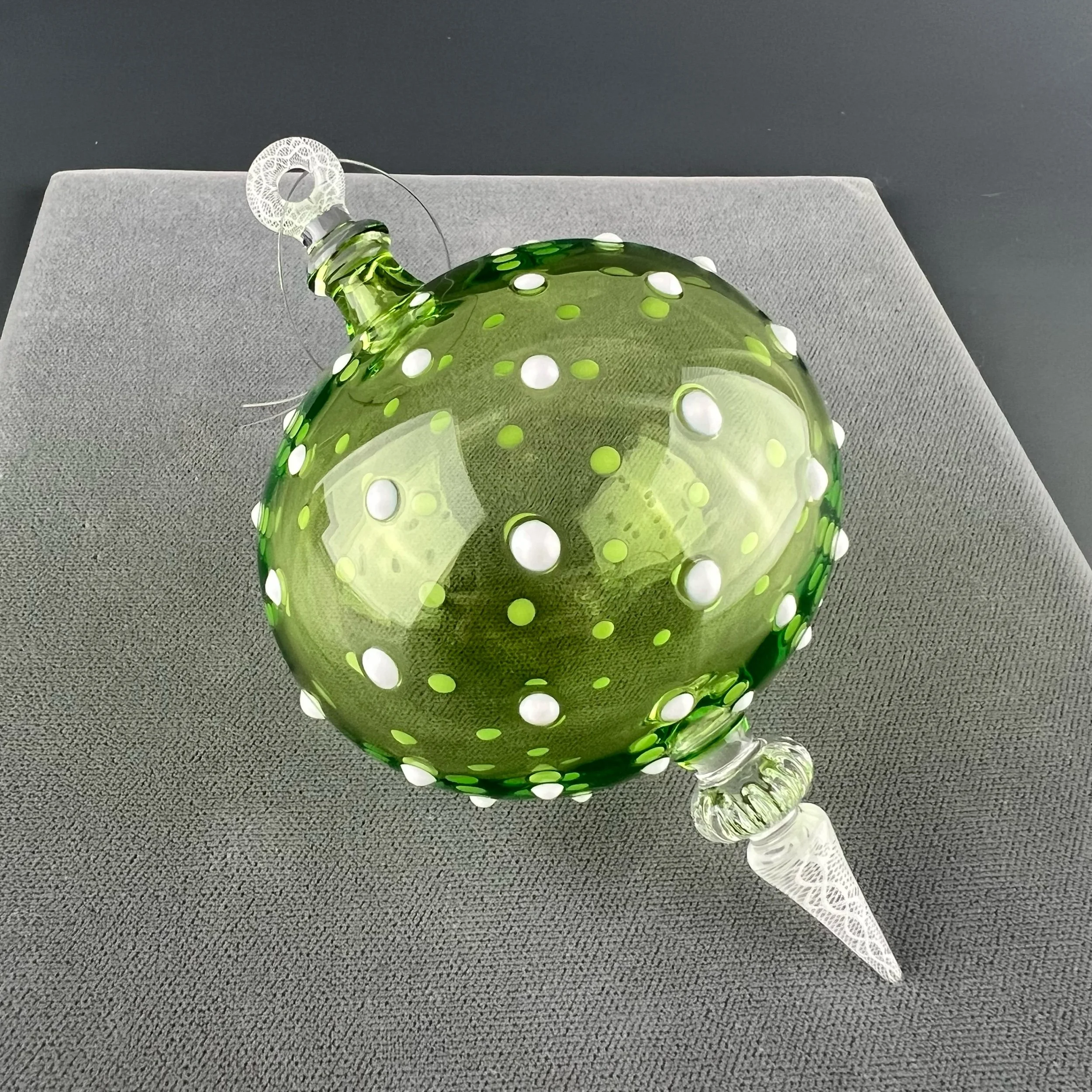 This nice hanging ornament is made with crisp transparent peridot green glass, decorated with a raised dot matrix pattern in enamel white. Finished with clear and white latticino helix cane elements.
