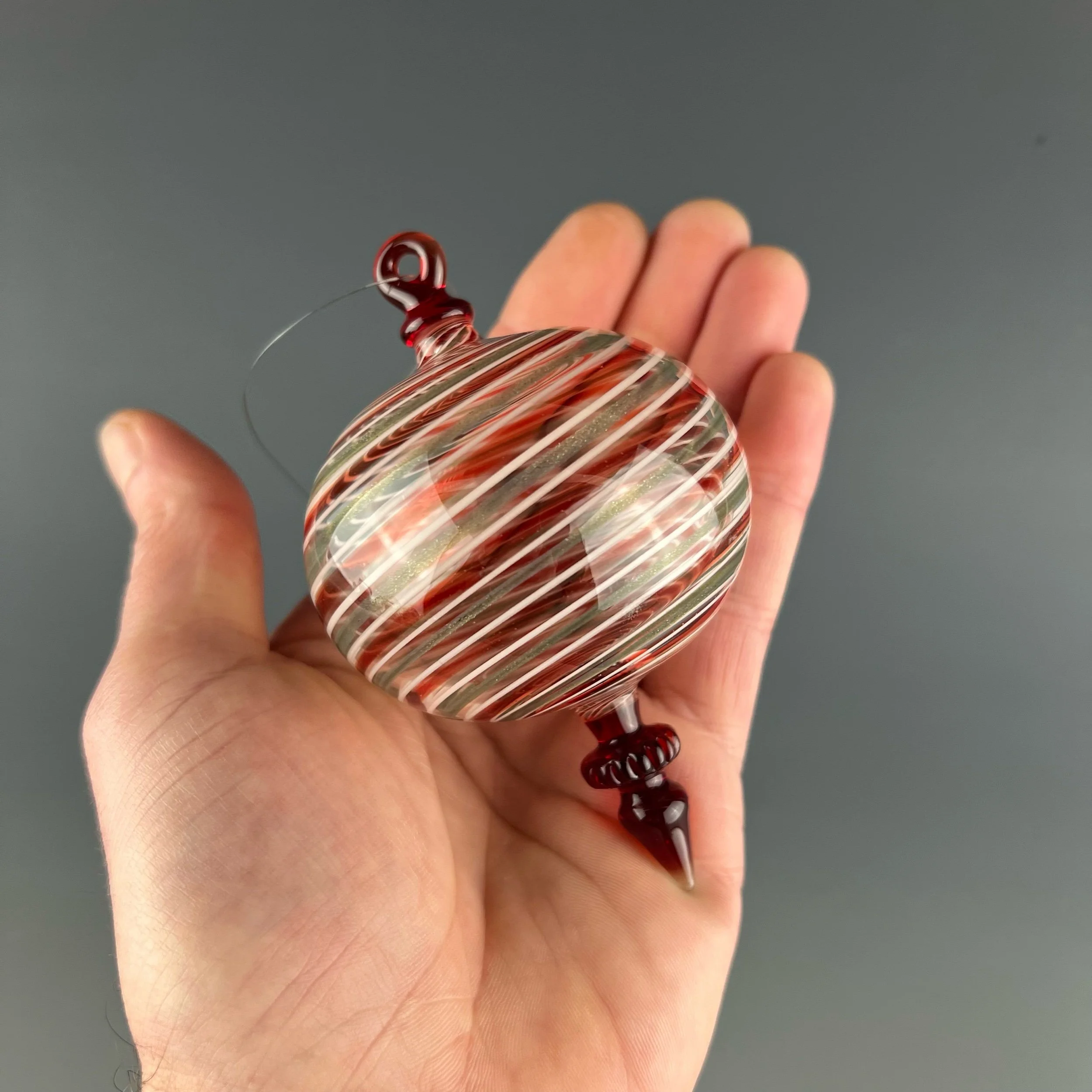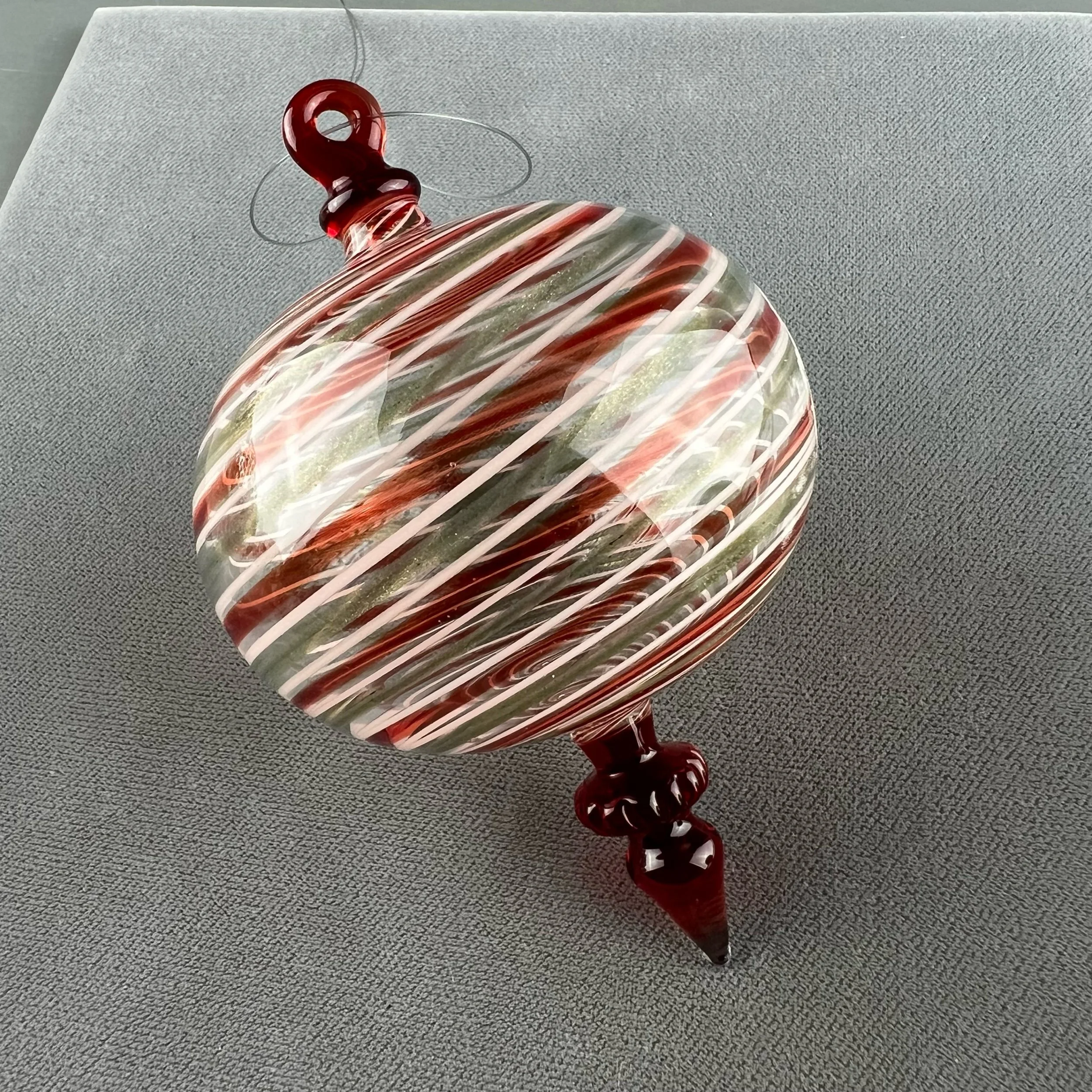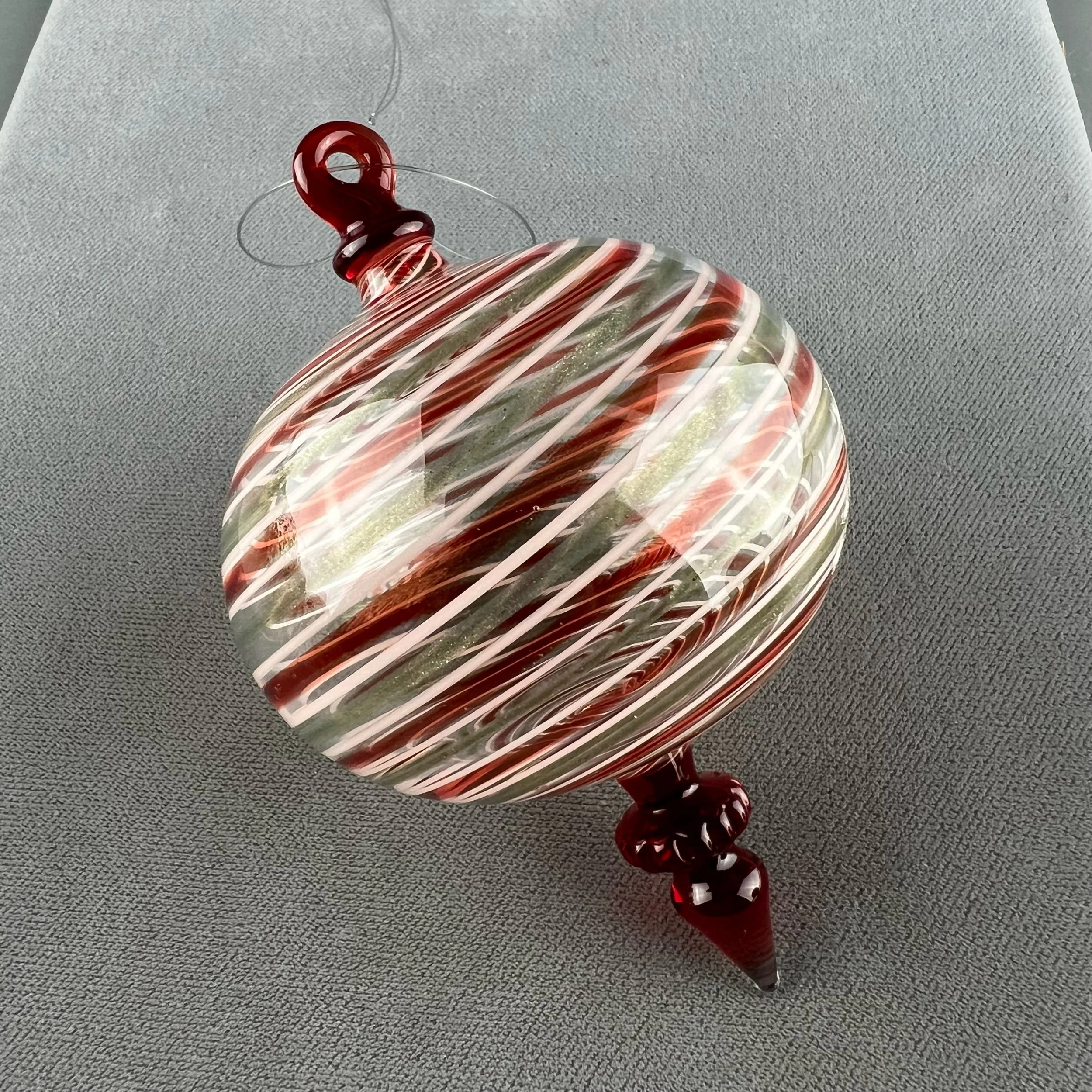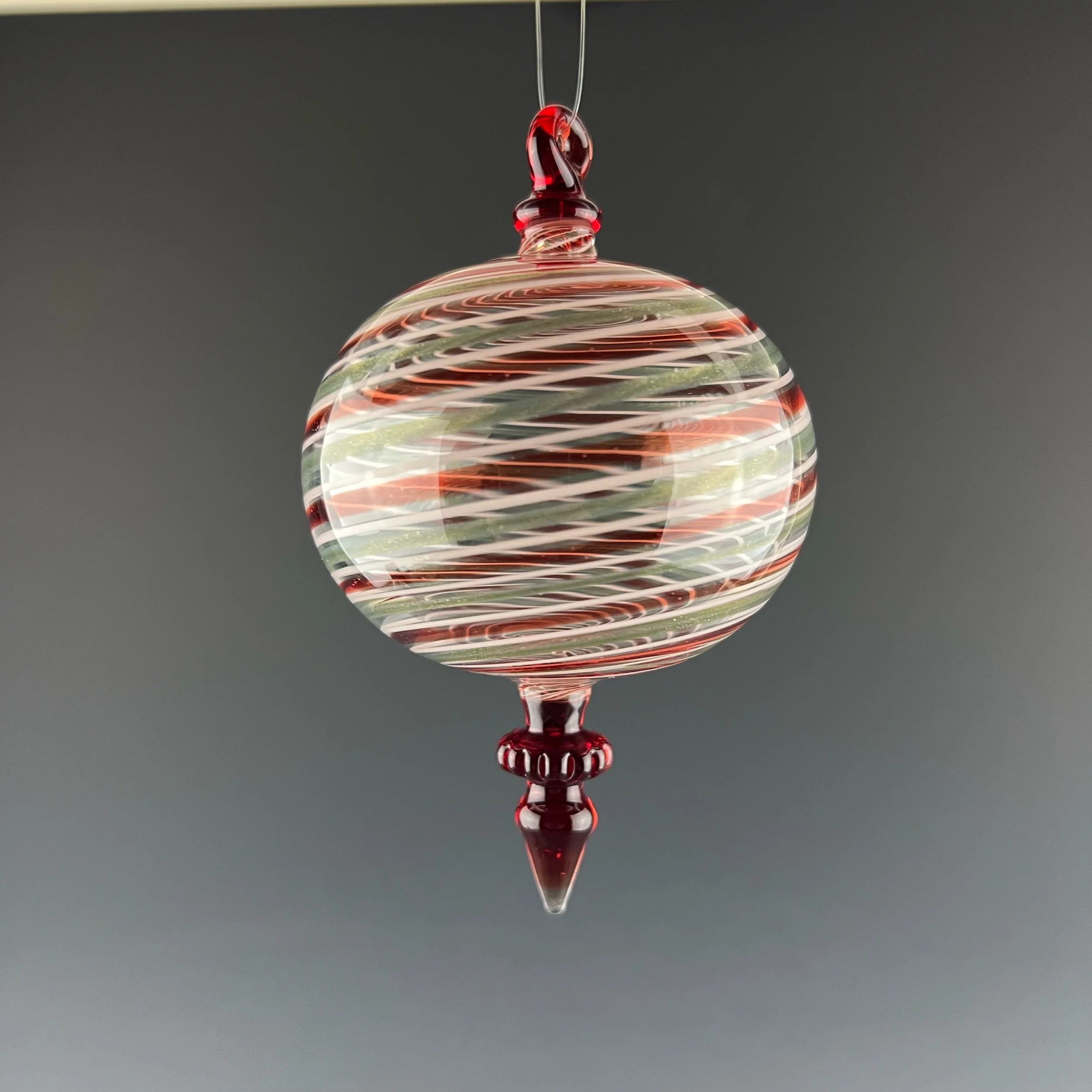 This nice and shapely hanging ornament has a ruby red, white, and green sparkle line twist with ruby red optic wheel, drop point and loop.