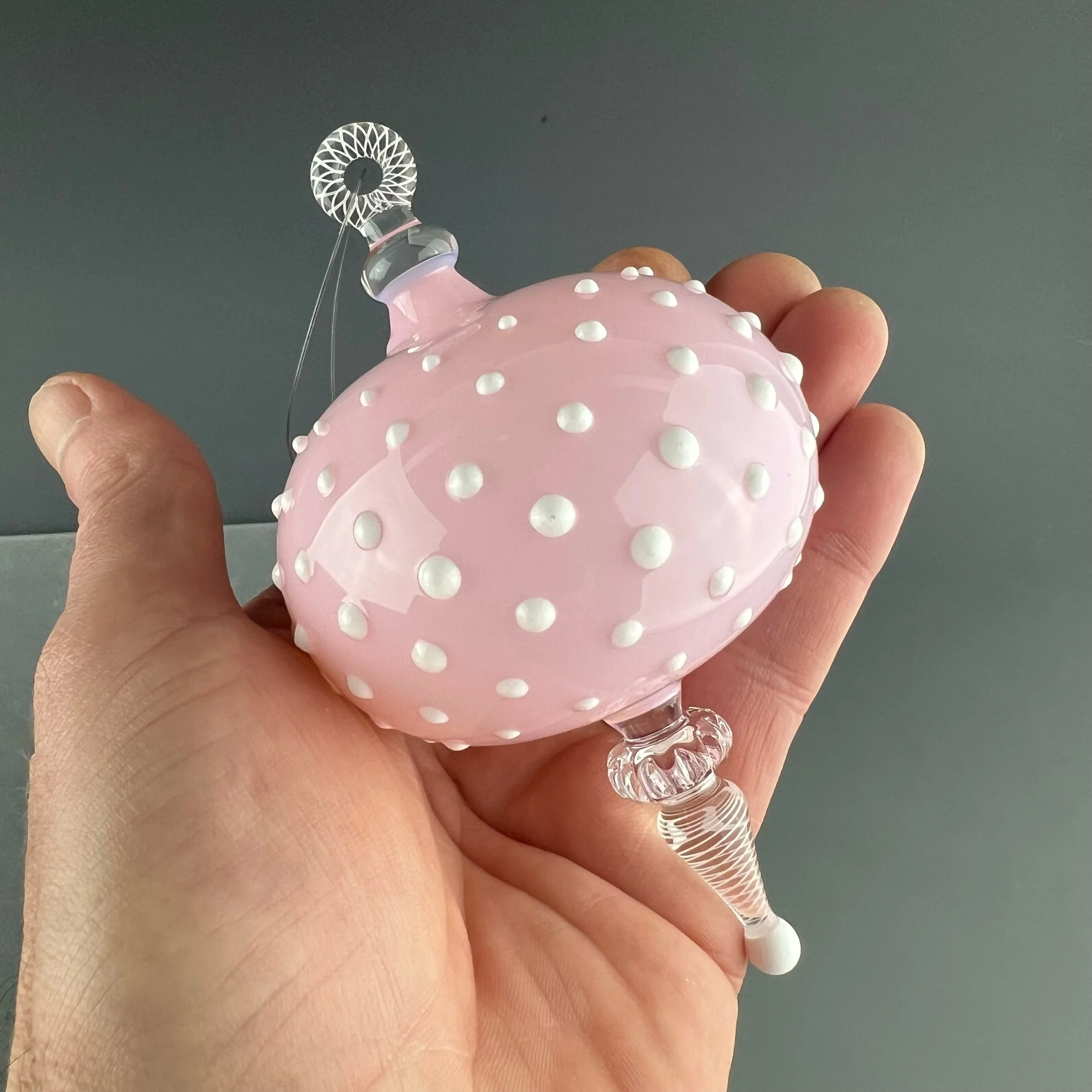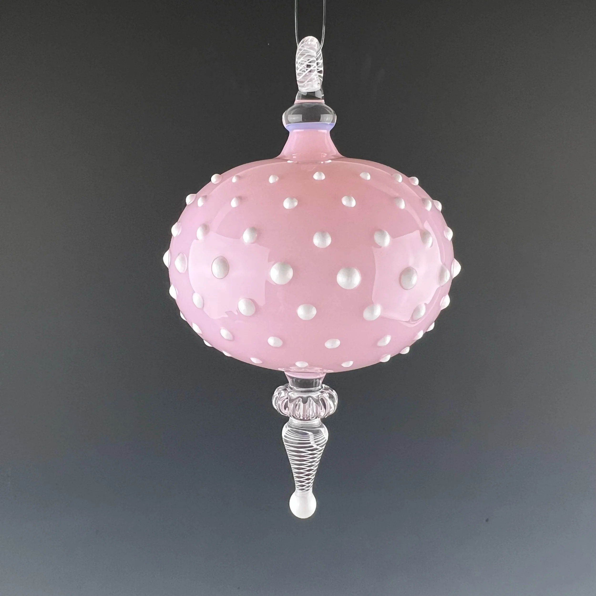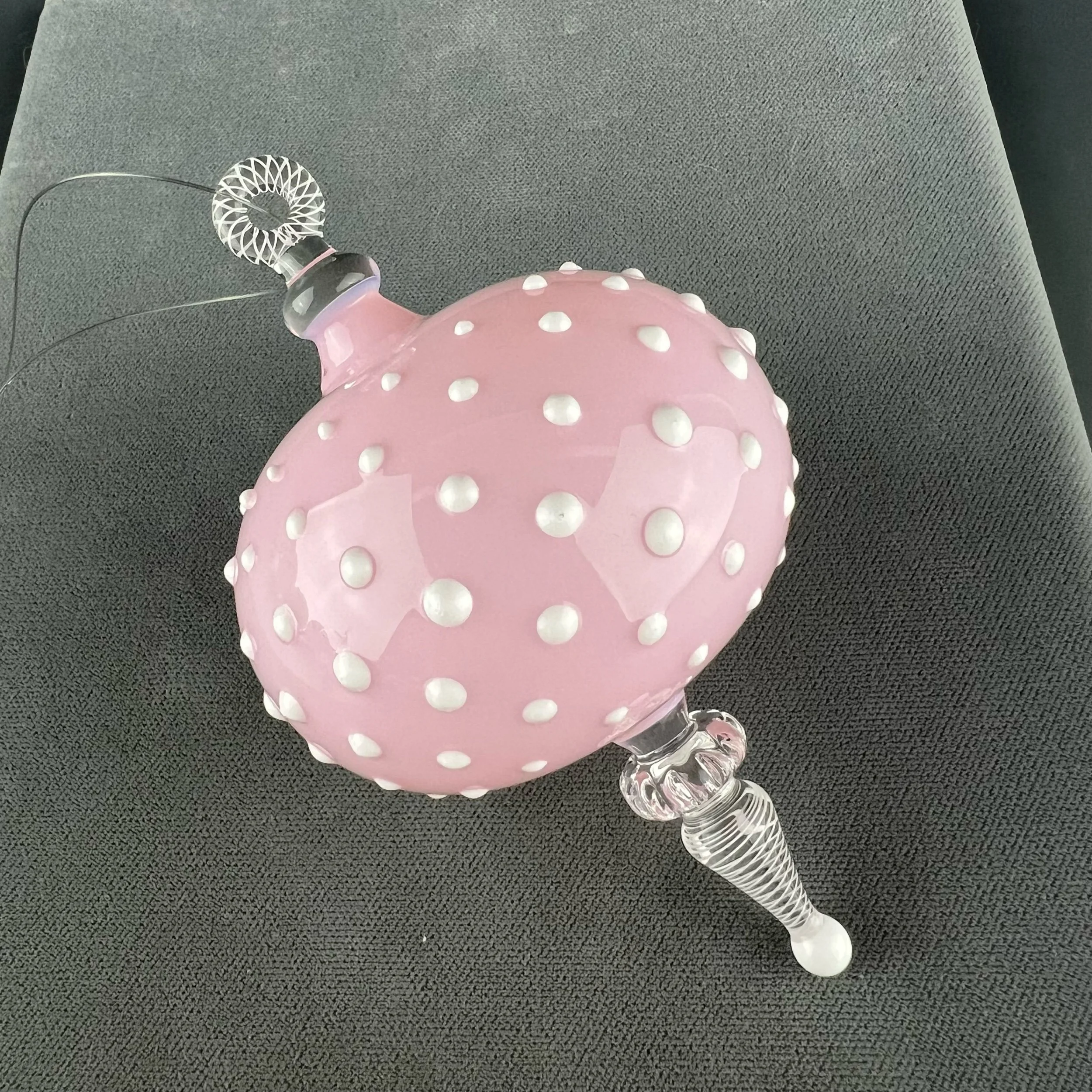 This nice hanging ornament is made with pink glass, decorated with a raised dot matrix pattern in enamel white. Finished with clear and white latticino cane elements.