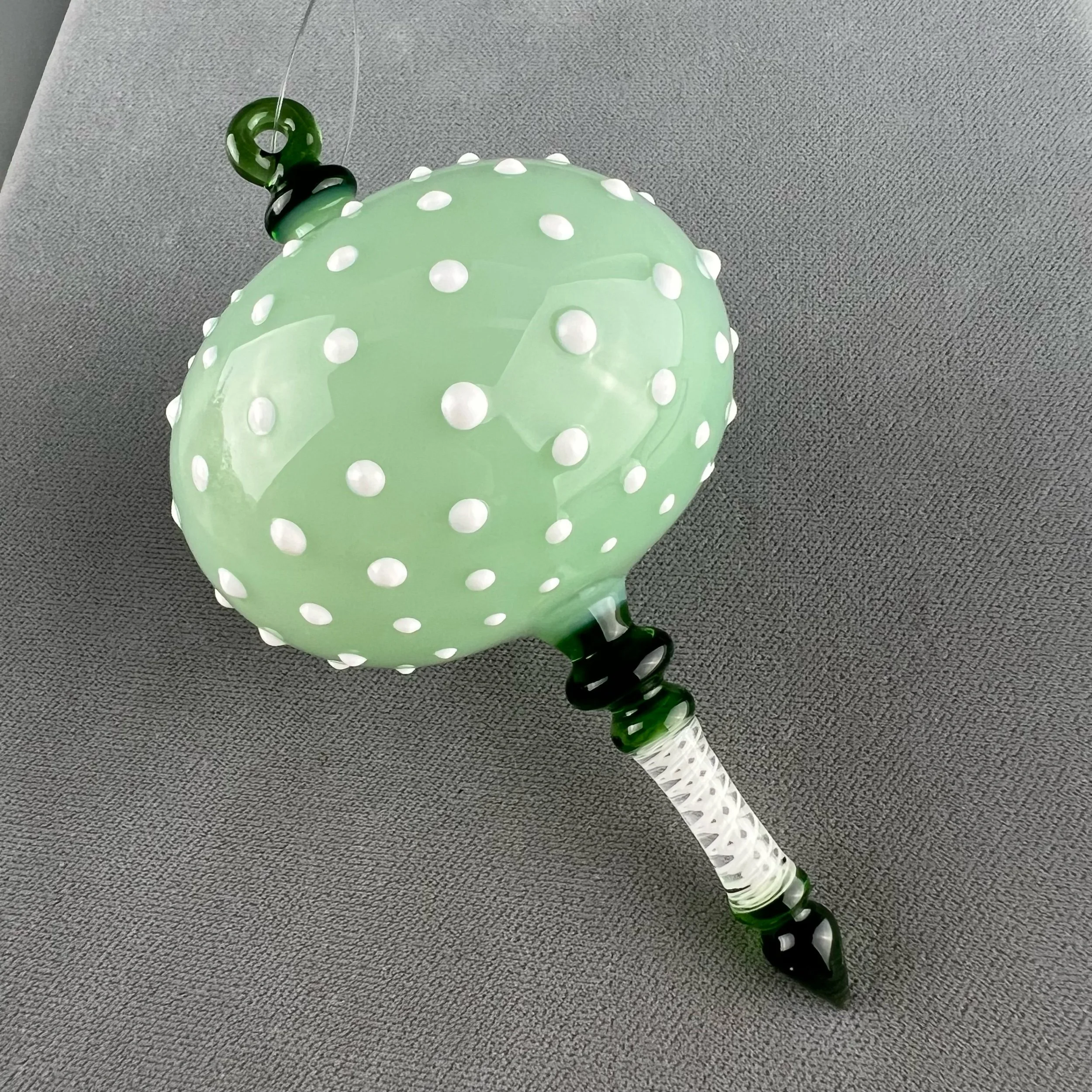 This nice hanging ornament is made with translucent jade green glass, decorated with a raised dot matrix pattern in enamel white. Finished with drop point in emerald green white Ballotini cane.