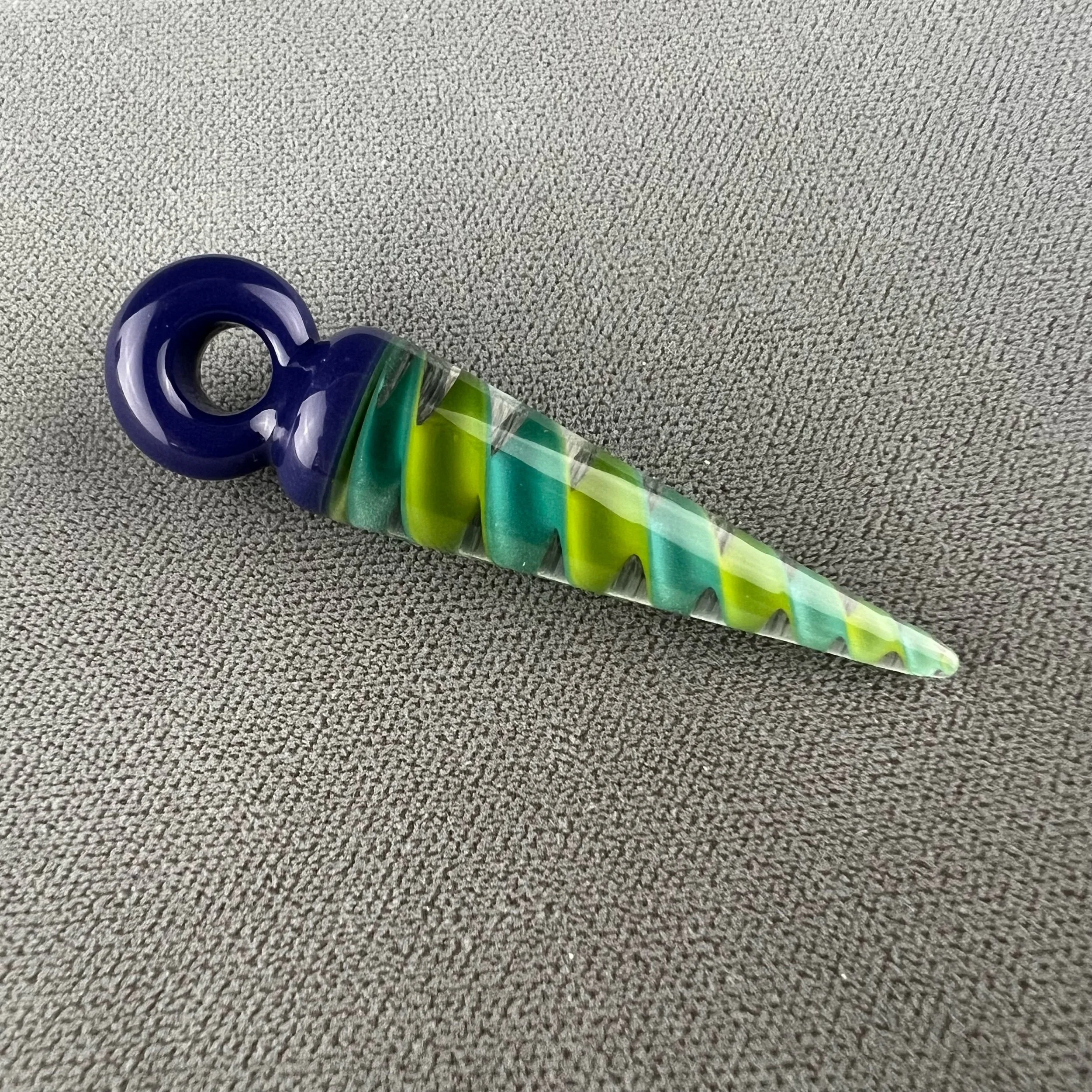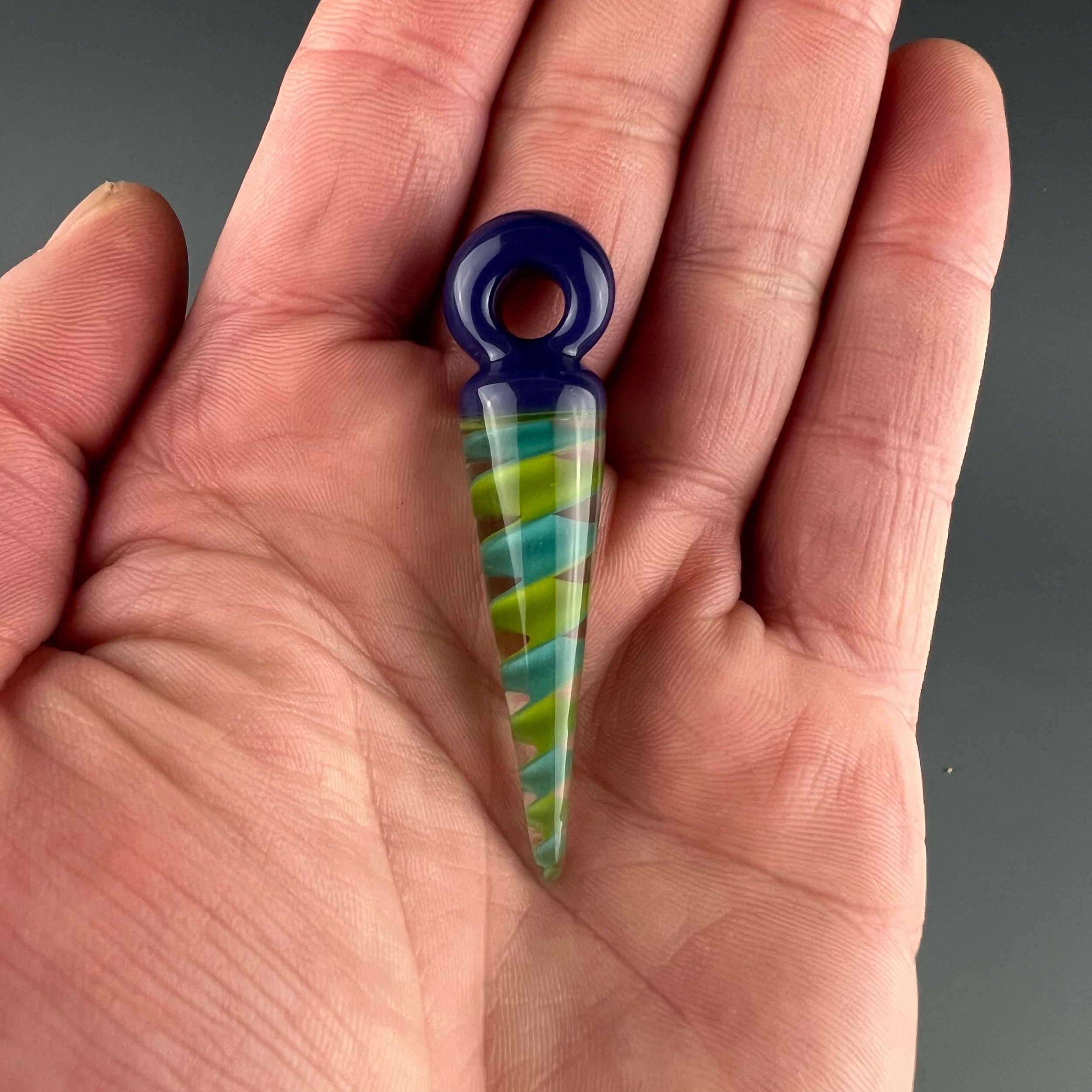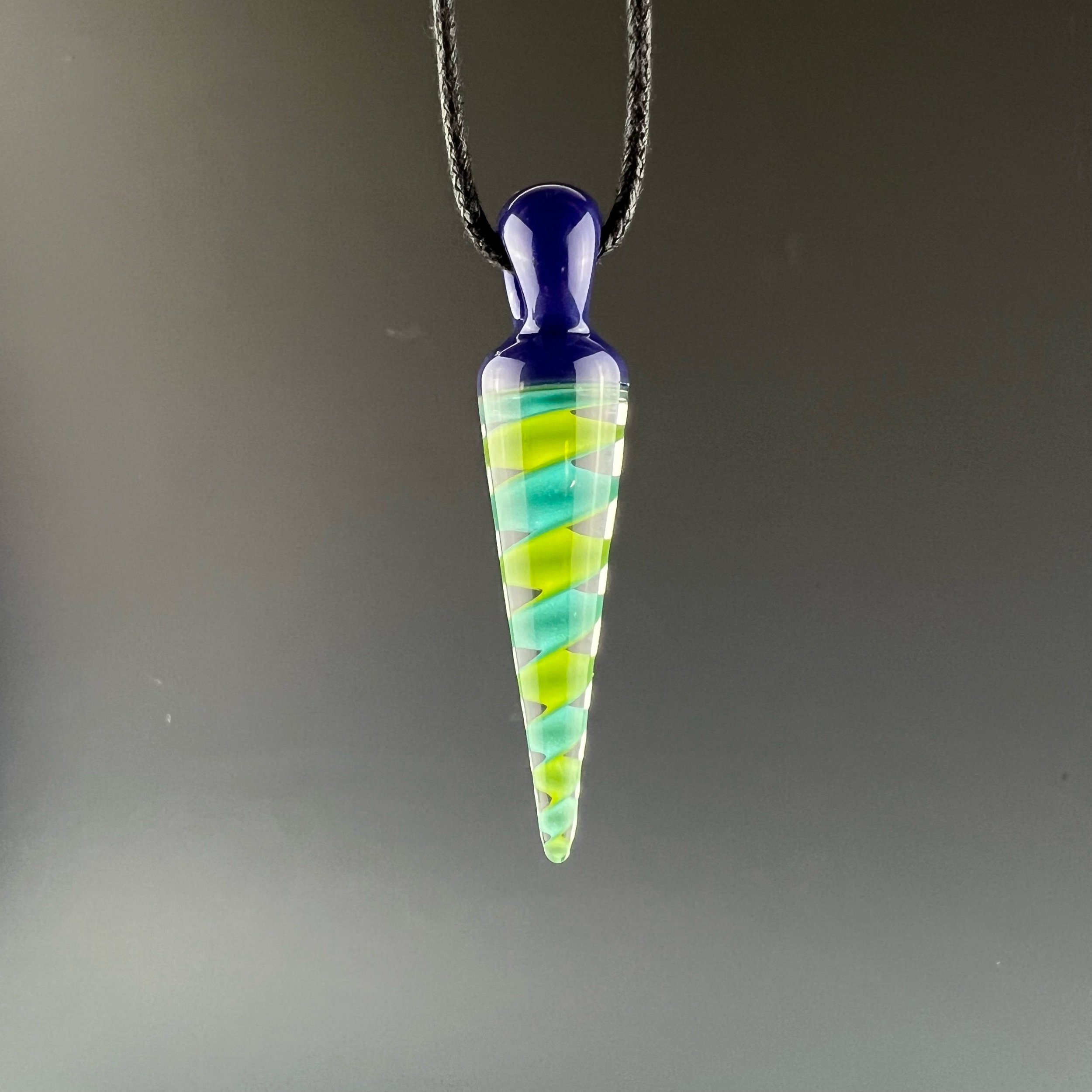 A nice pendulum pendant made with green/aqua ribbon cane, with blue-violet bail.