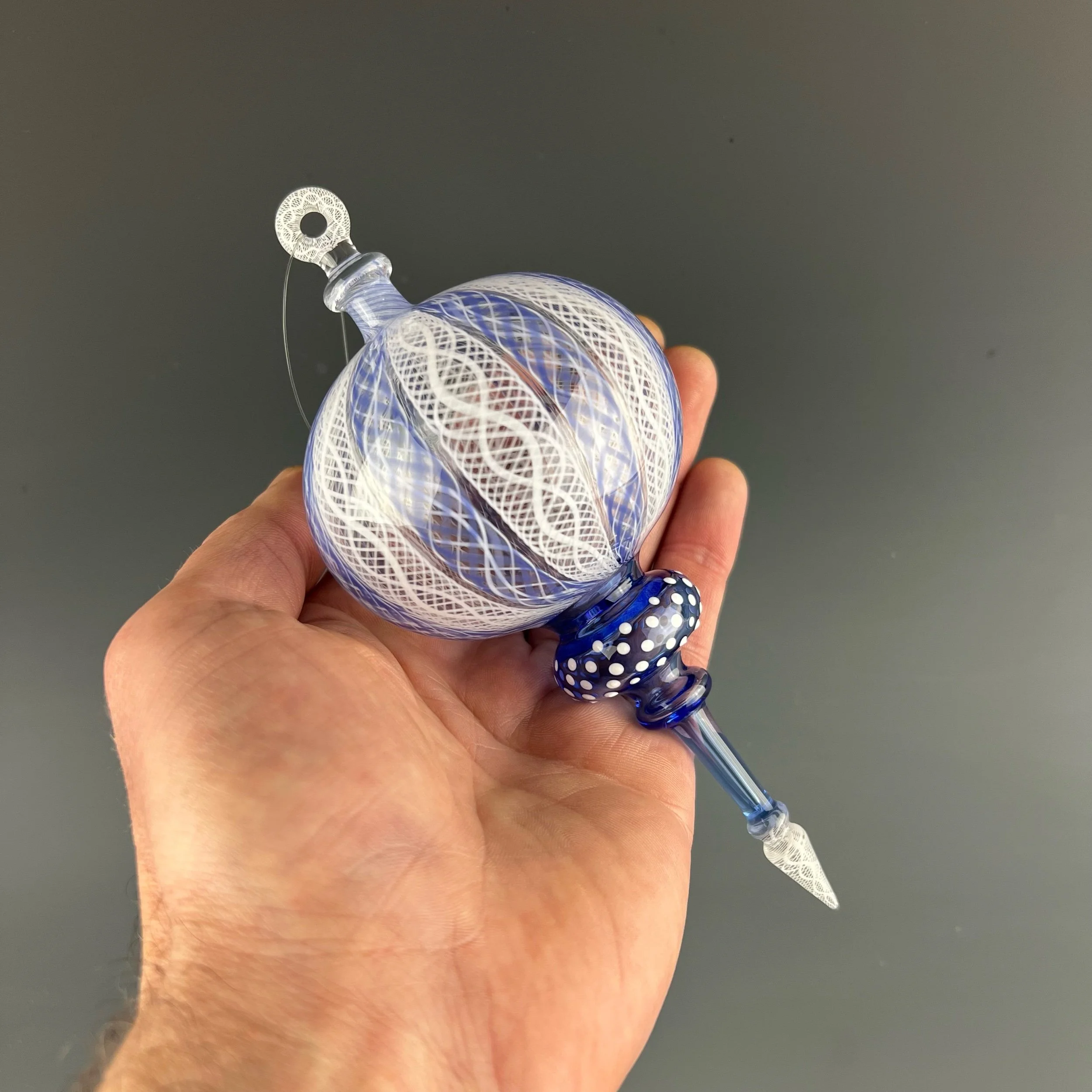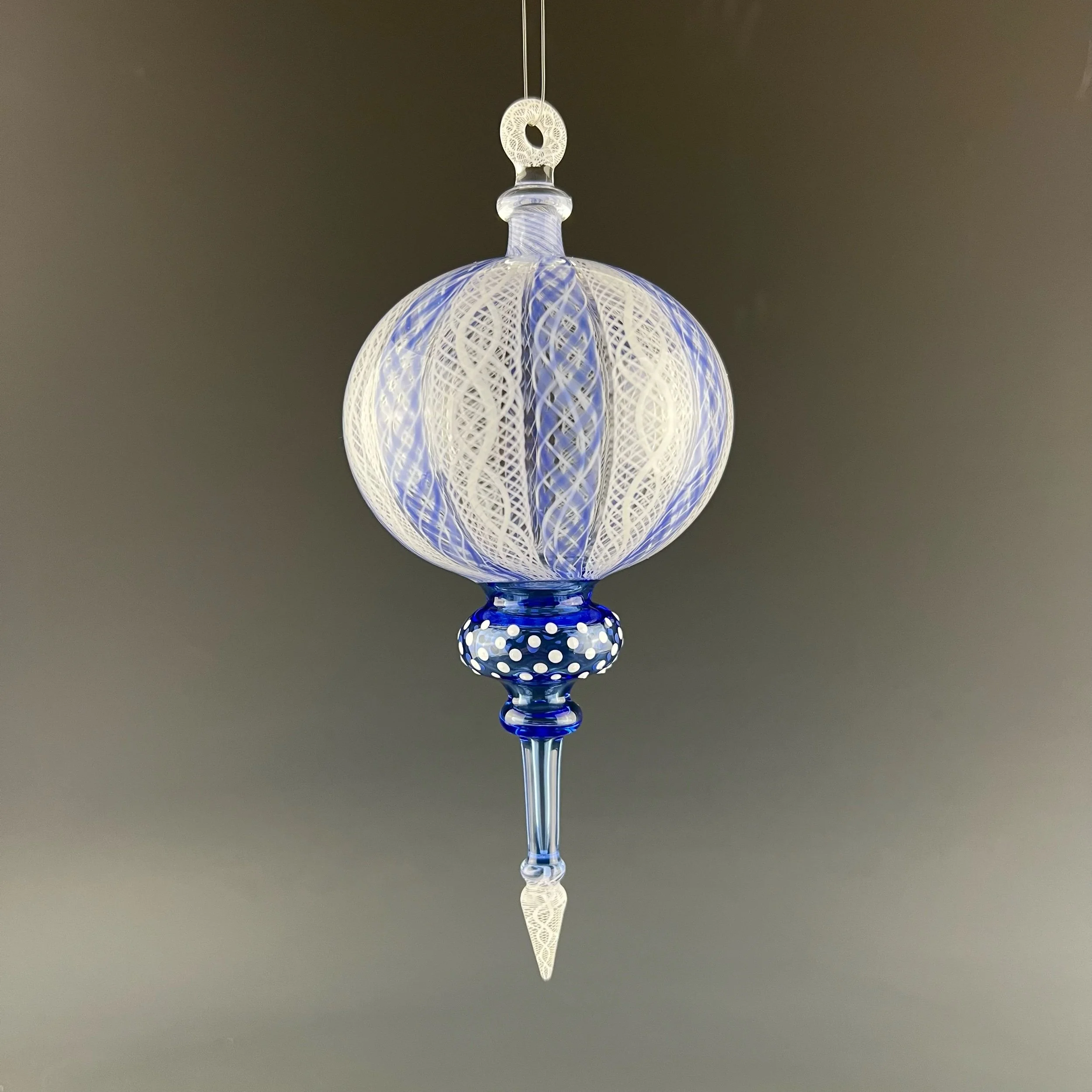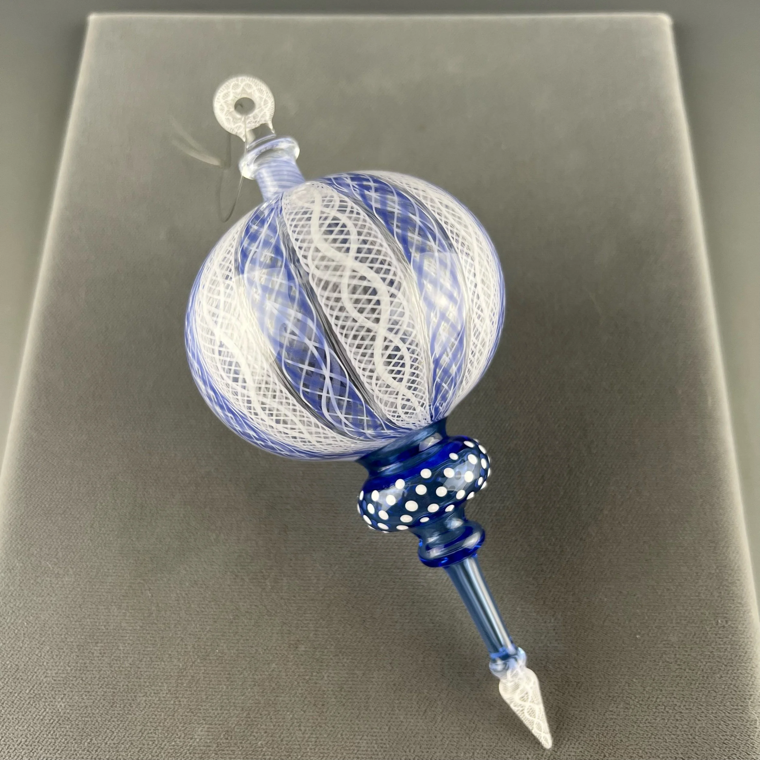 This nice and shapely hanging ornament with a periwinkle blue and white zanfirico cane pattern, a transparent sky blue lower section with white dot pattern, finished with white/clear helix cane point and loop.