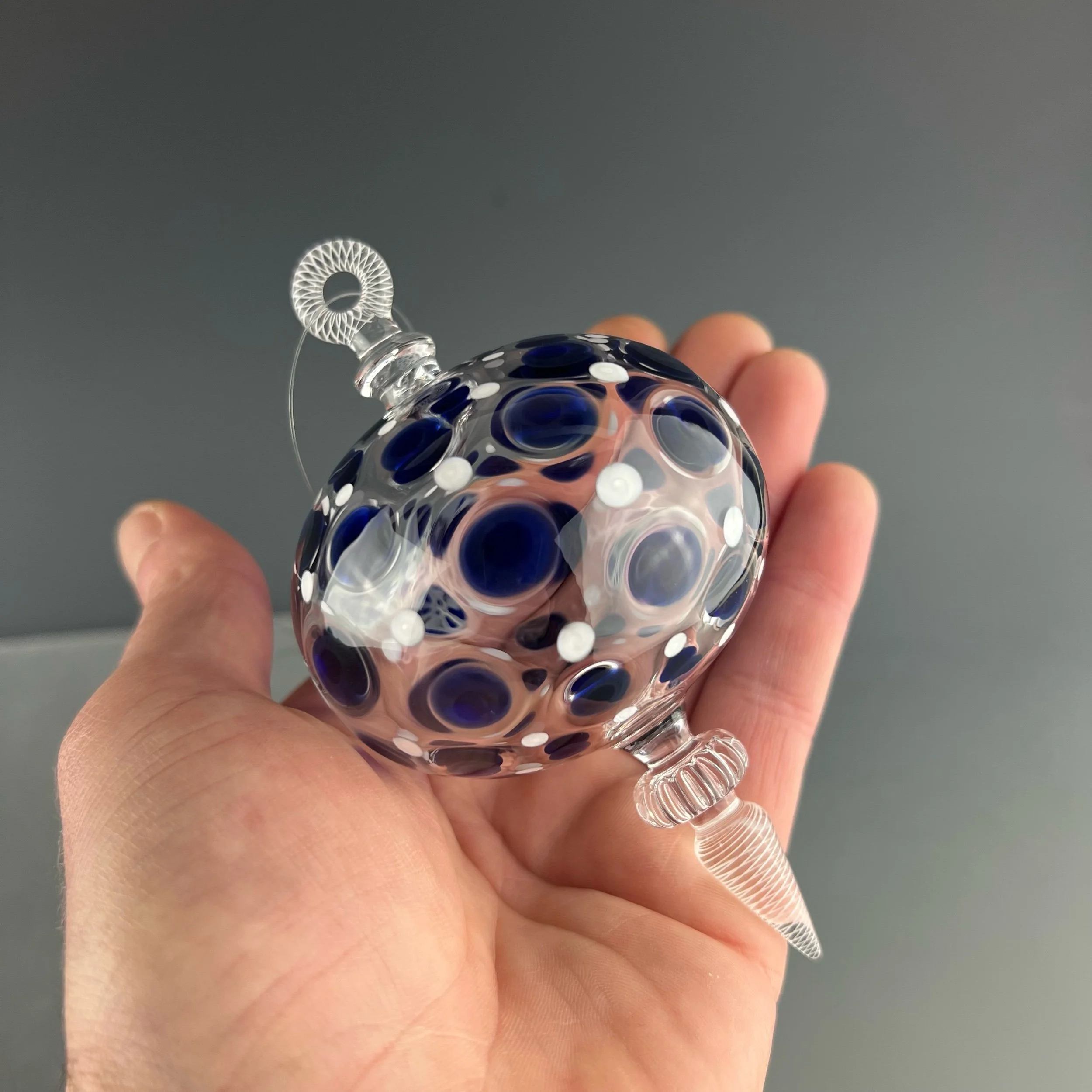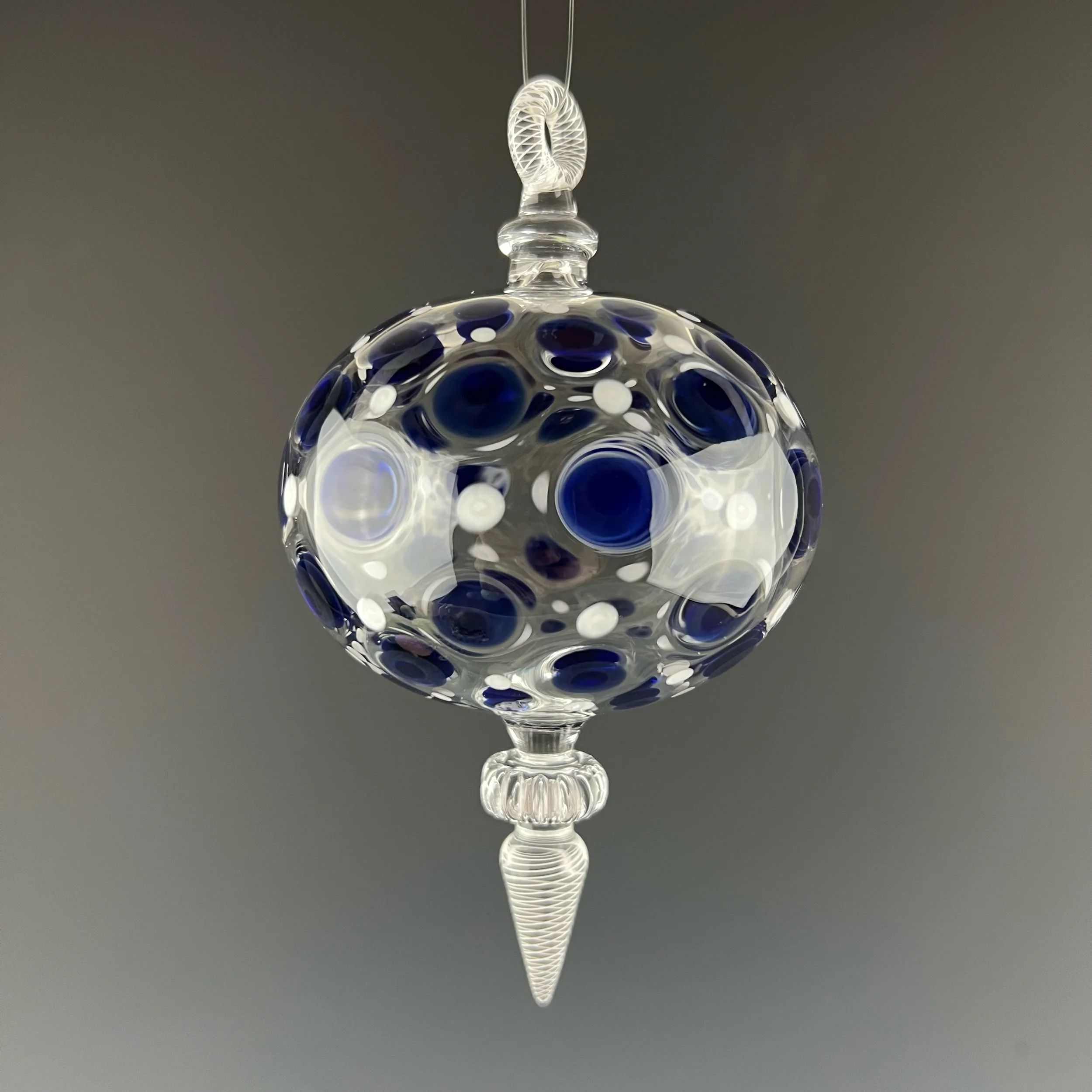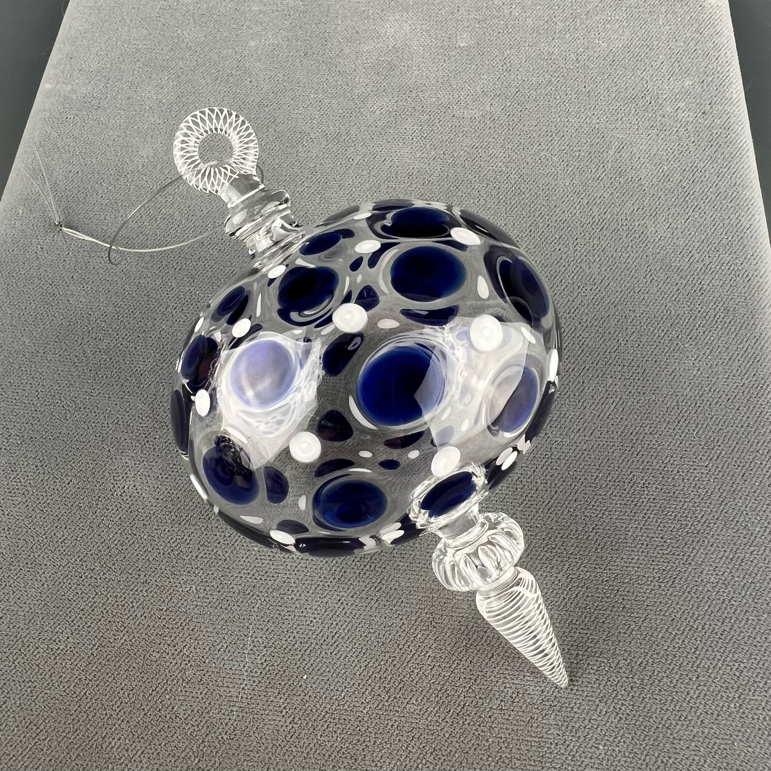 This nice hanging ornament is made with clear glass, decorated with a dot matrix pattern in dark transparent cobalt blue and white. Finished with decorative clear optic wheel with white filigree drop point and loop.