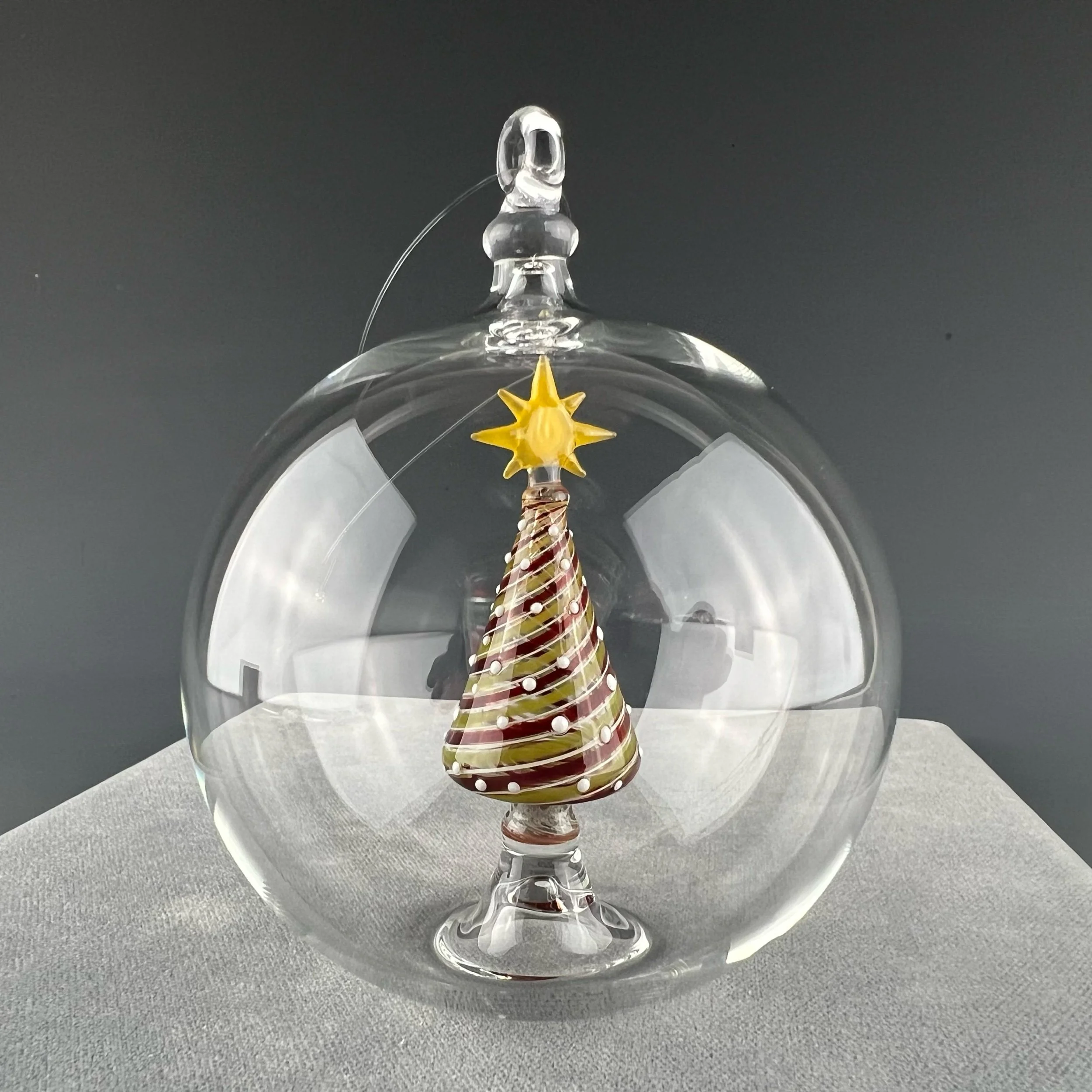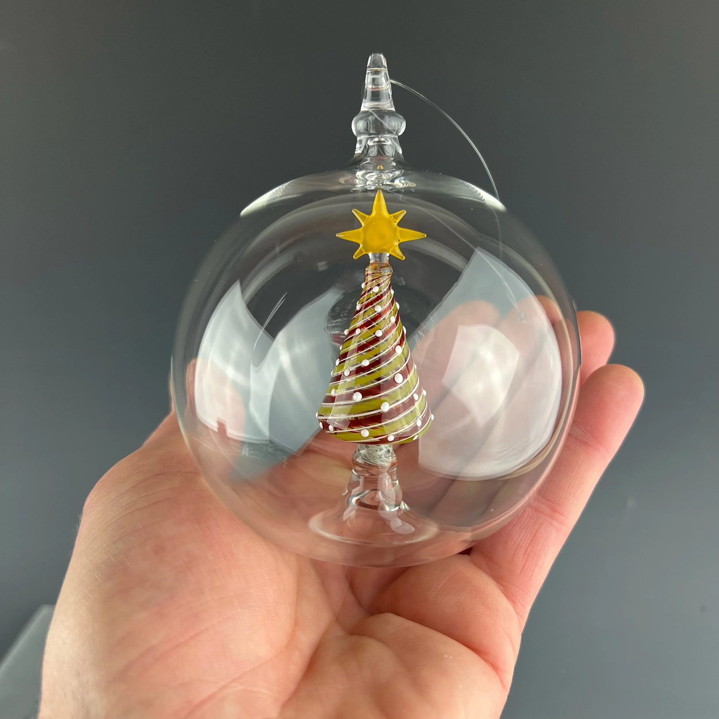 A clear globe ornament holds a fully decorated tree. Made with a white filigree, transparent Ruby and green line twist pattern with a sprinkle of white dots. Topped with a golden yellow star.