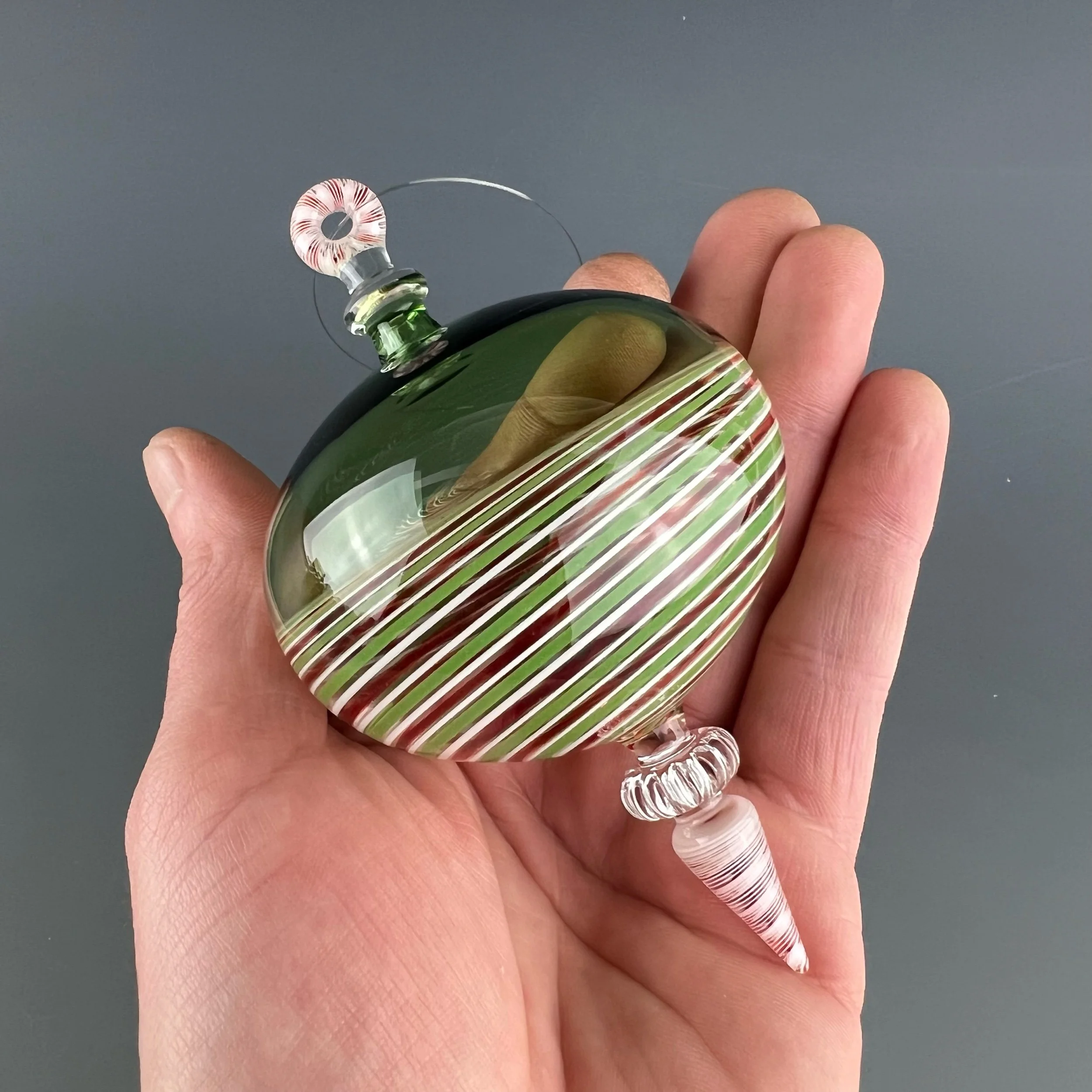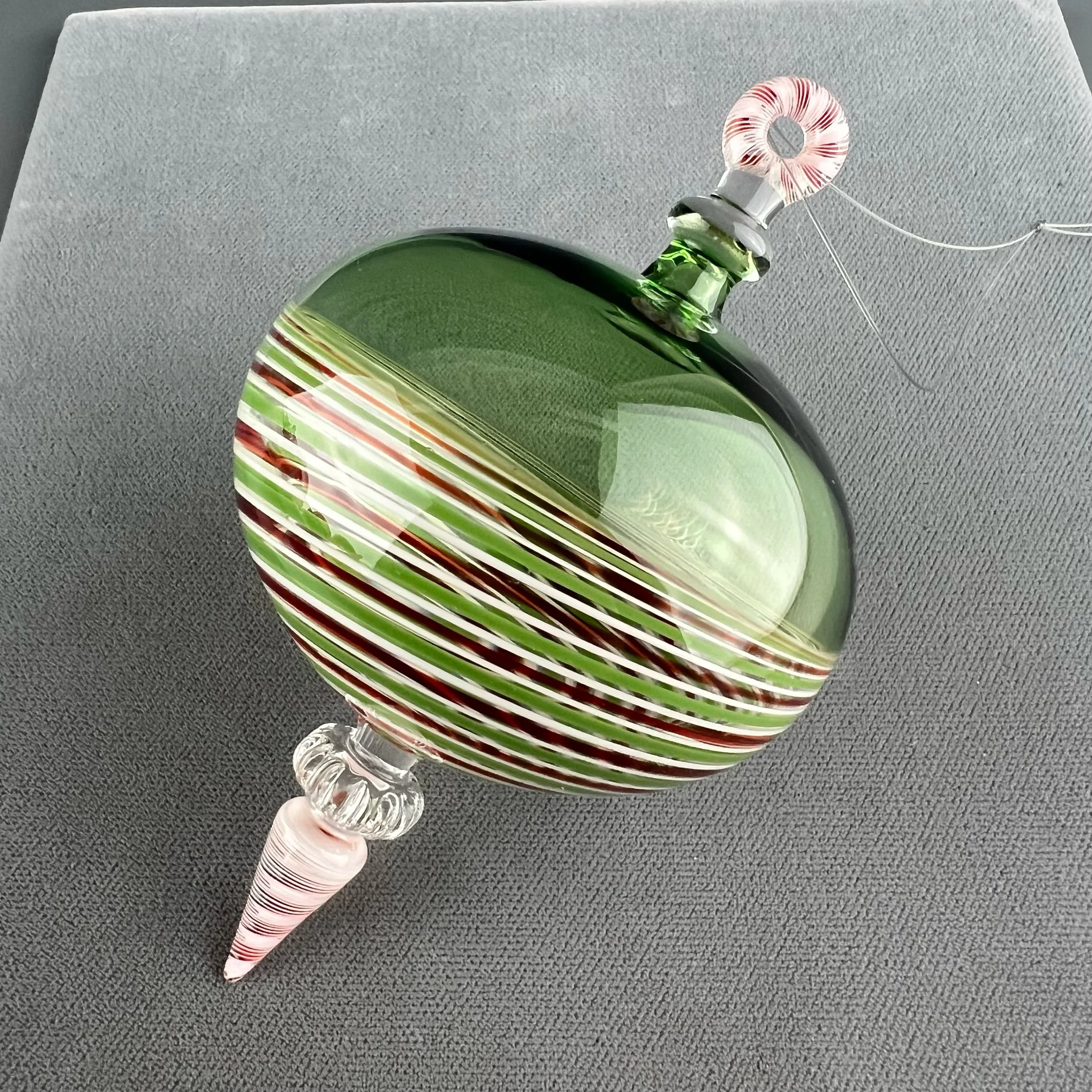 This nice hanging ornament is made with transparent emerald green glass, with a ruby/white/green line twist section. Finished with clear and ruby/white ribbon cane elements ..