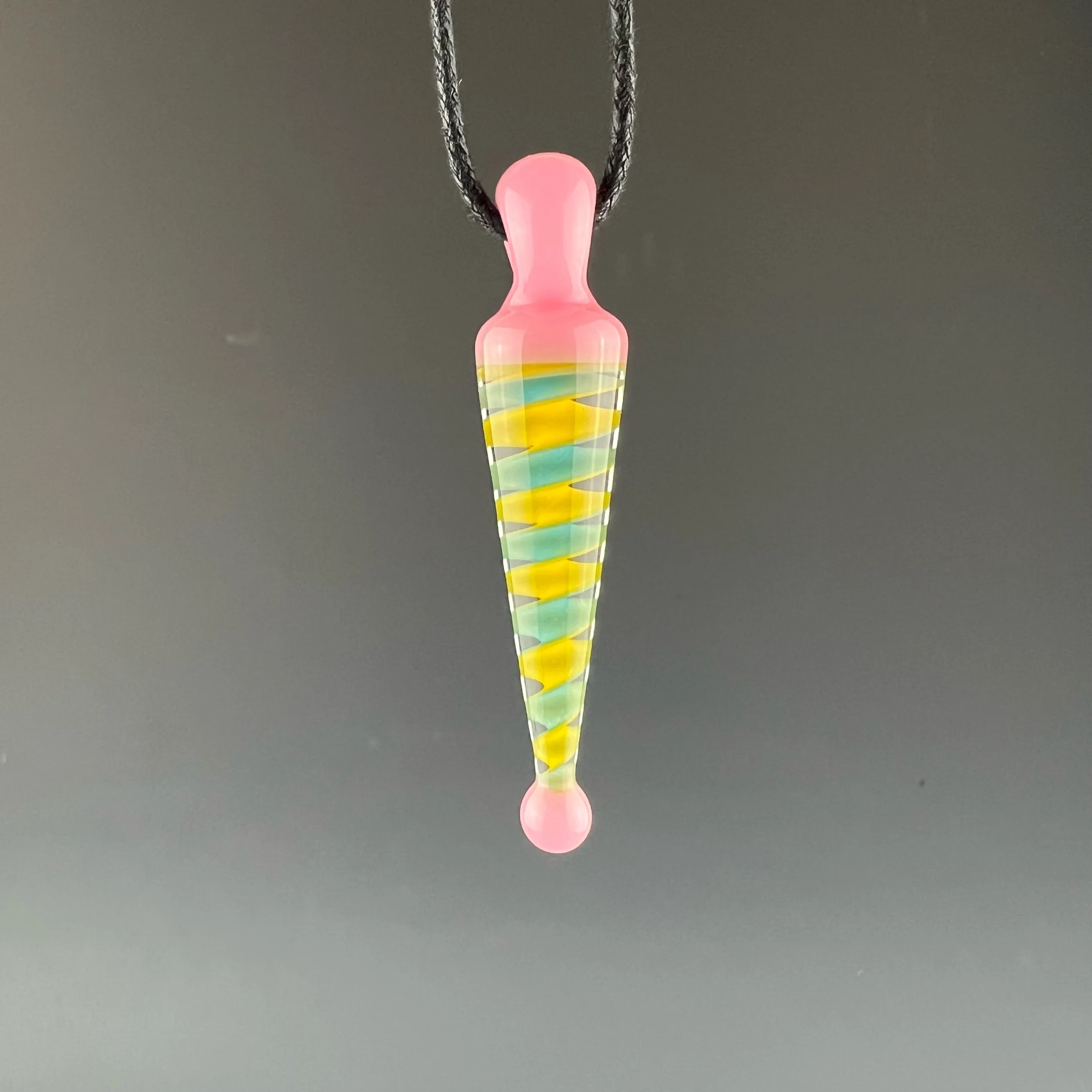 A nice pendulum pendant made with yellow/aqua ribbon cane, with blush pink bail and ball.