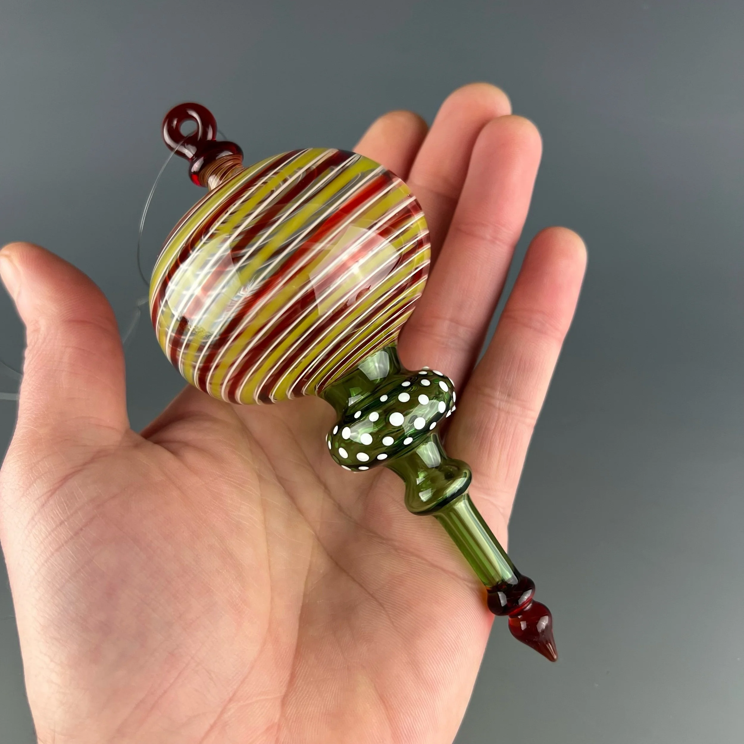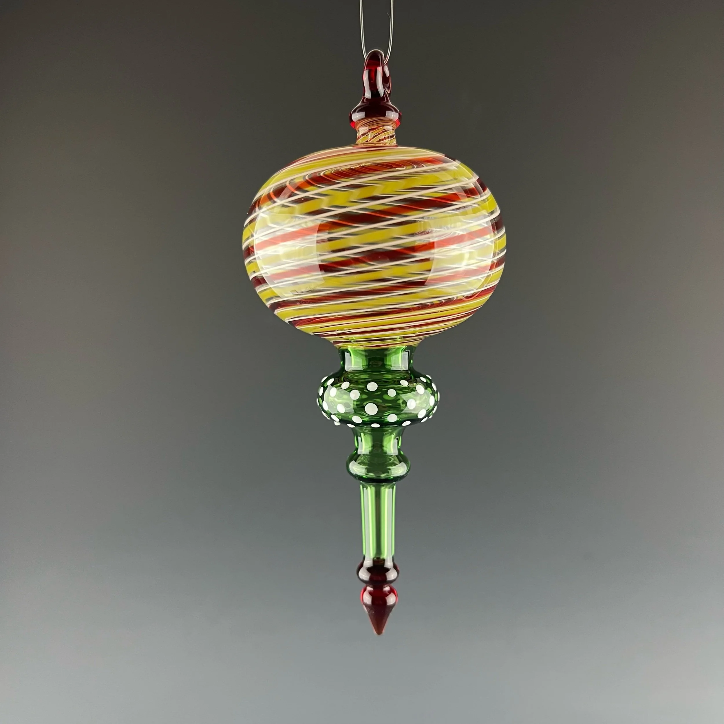 This nice and shapely hanging ornament has a ruby red, white, and green line twist, transparent emerald green lower section with white dot pattern and ruby red drop point and loop.