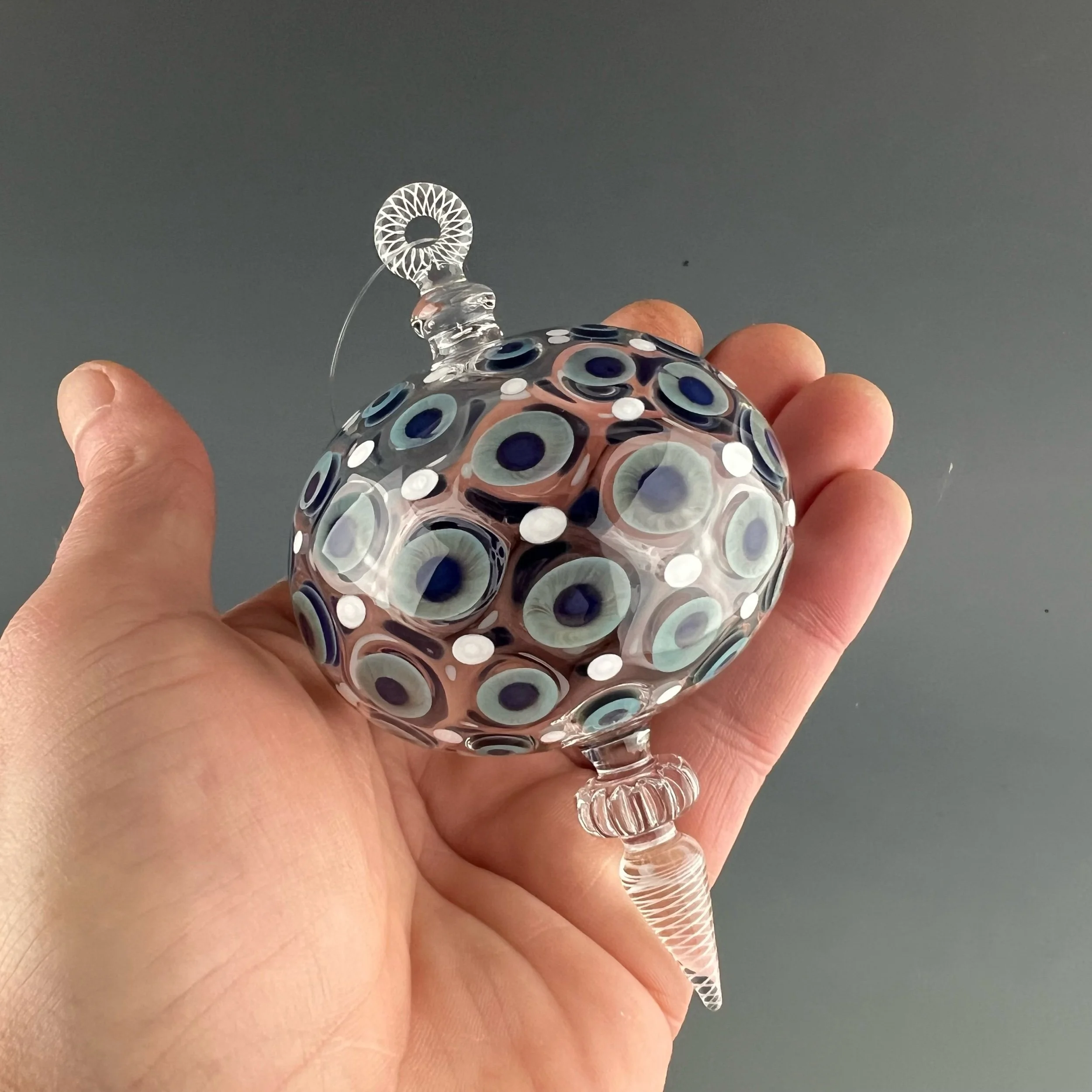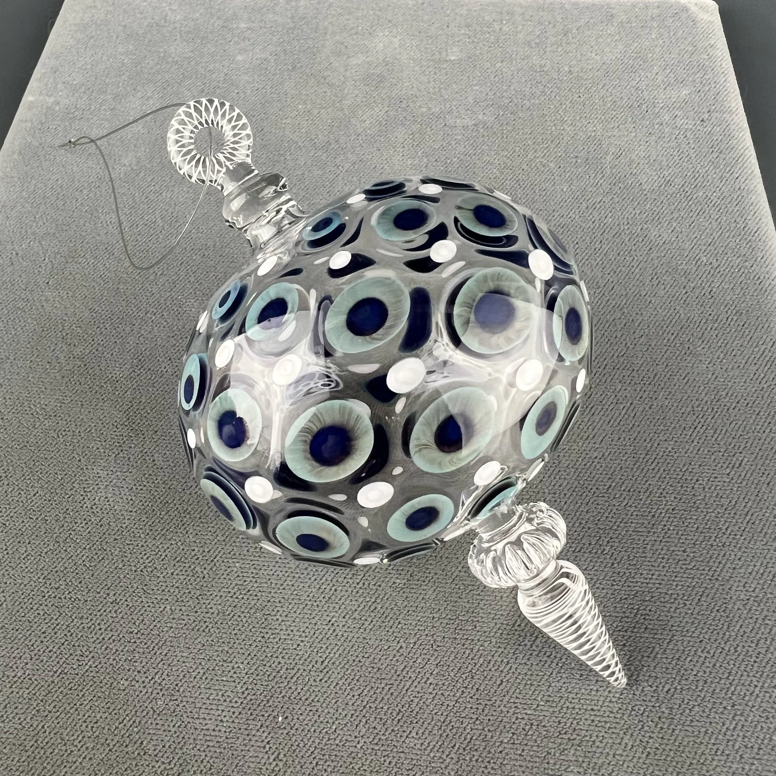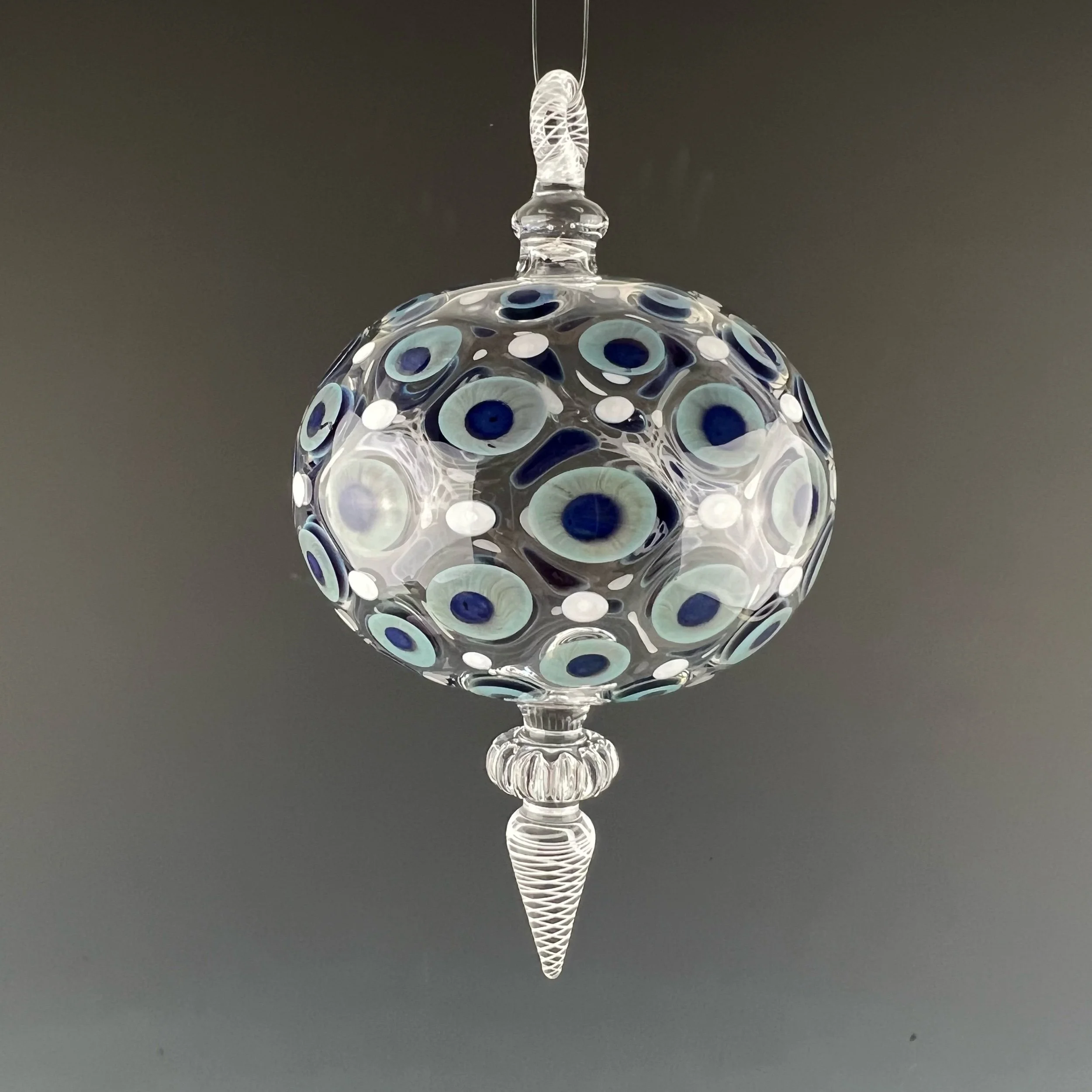 This nice hanging ornament is made with clear glass, decorated with a dot matrix pattern in blue-moon and white. Finished with decorative clear optic wheel with white filigree drop point and loop.