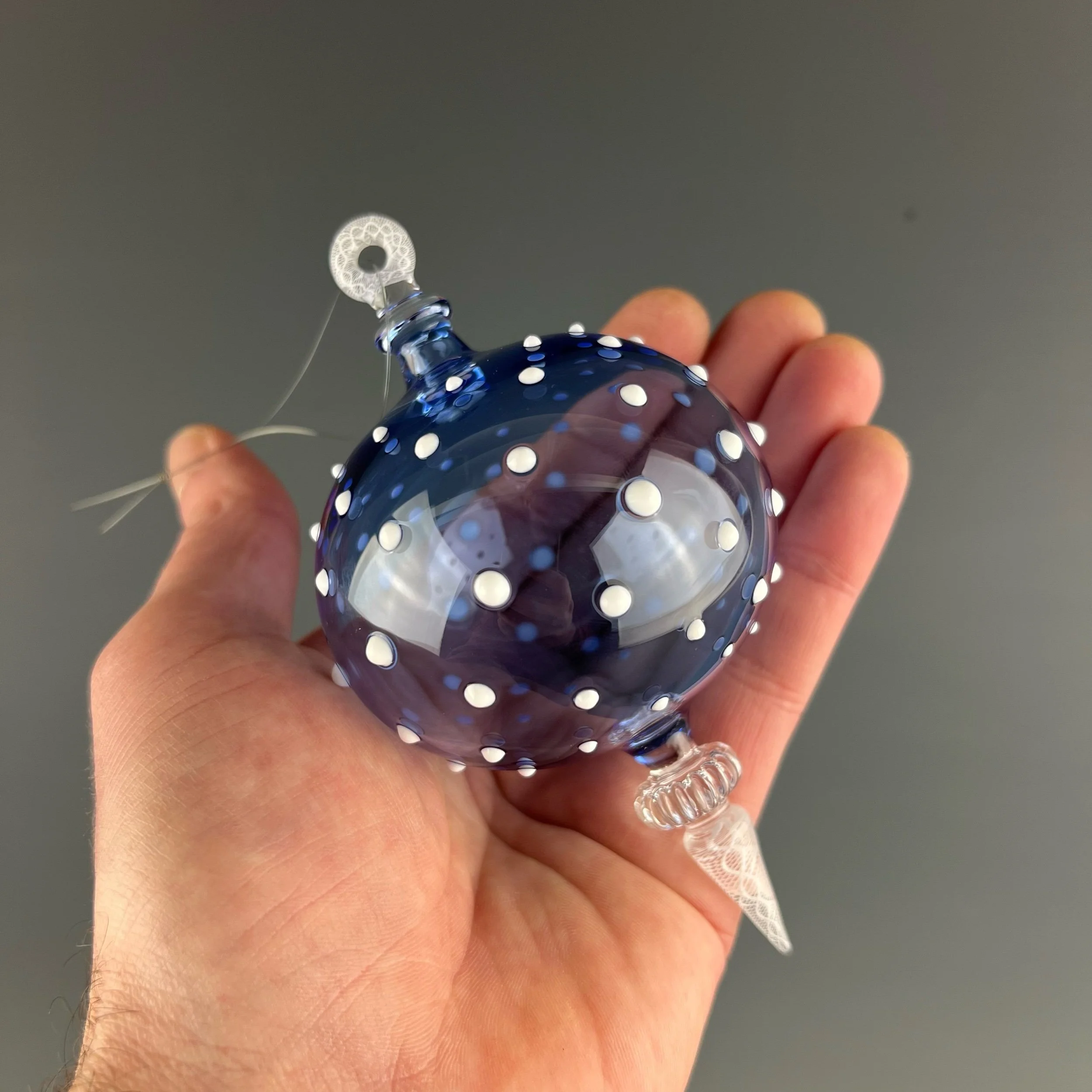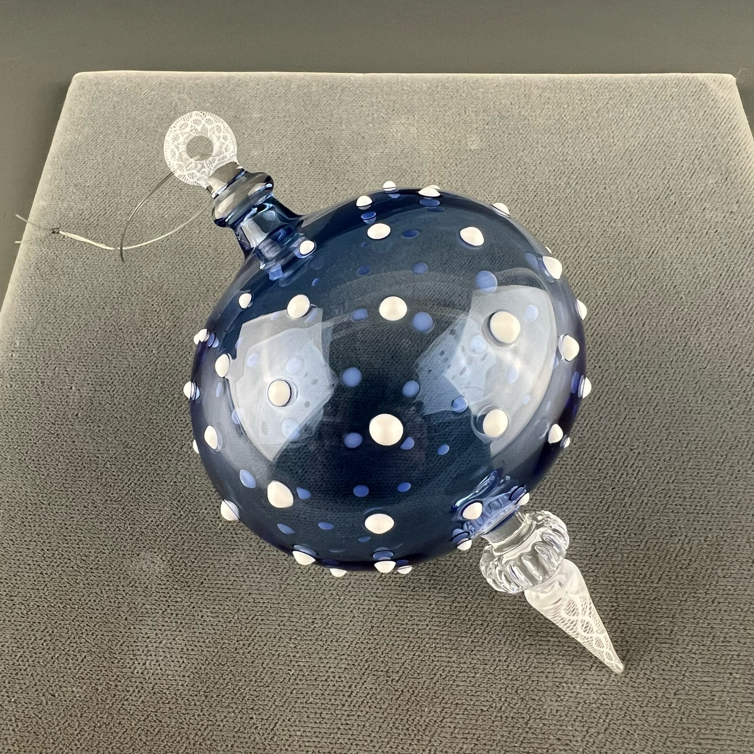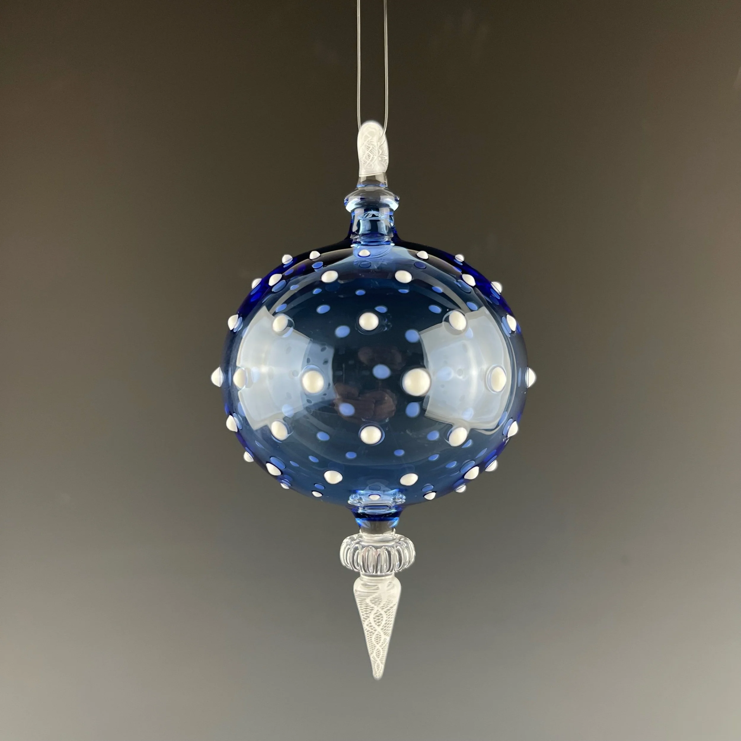 This nice hanging ornament is made with crisp transparent sky blue glass, decorated with a raised dot matrix pattern in enamel white. Finished with clear and white latticino helix cane elements.