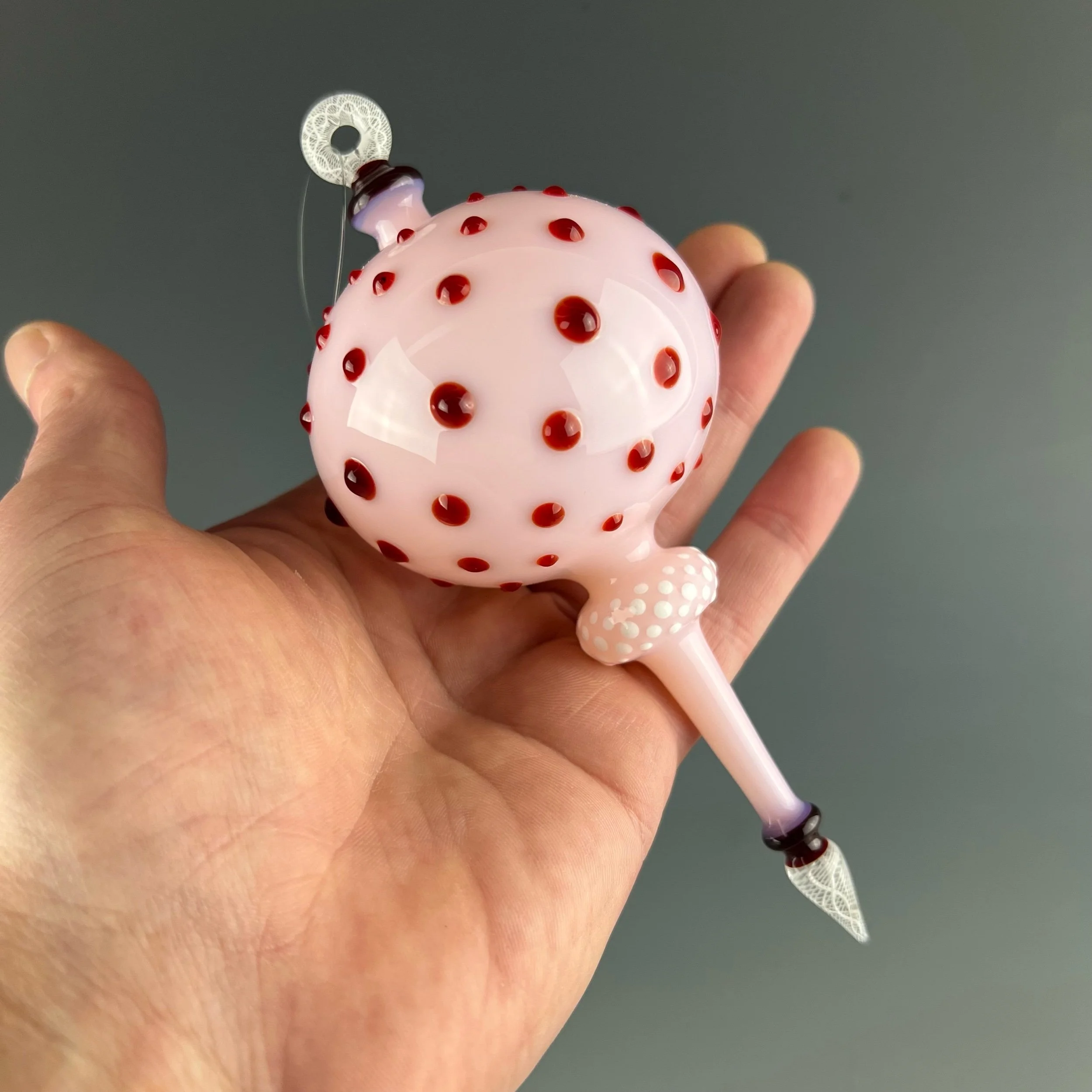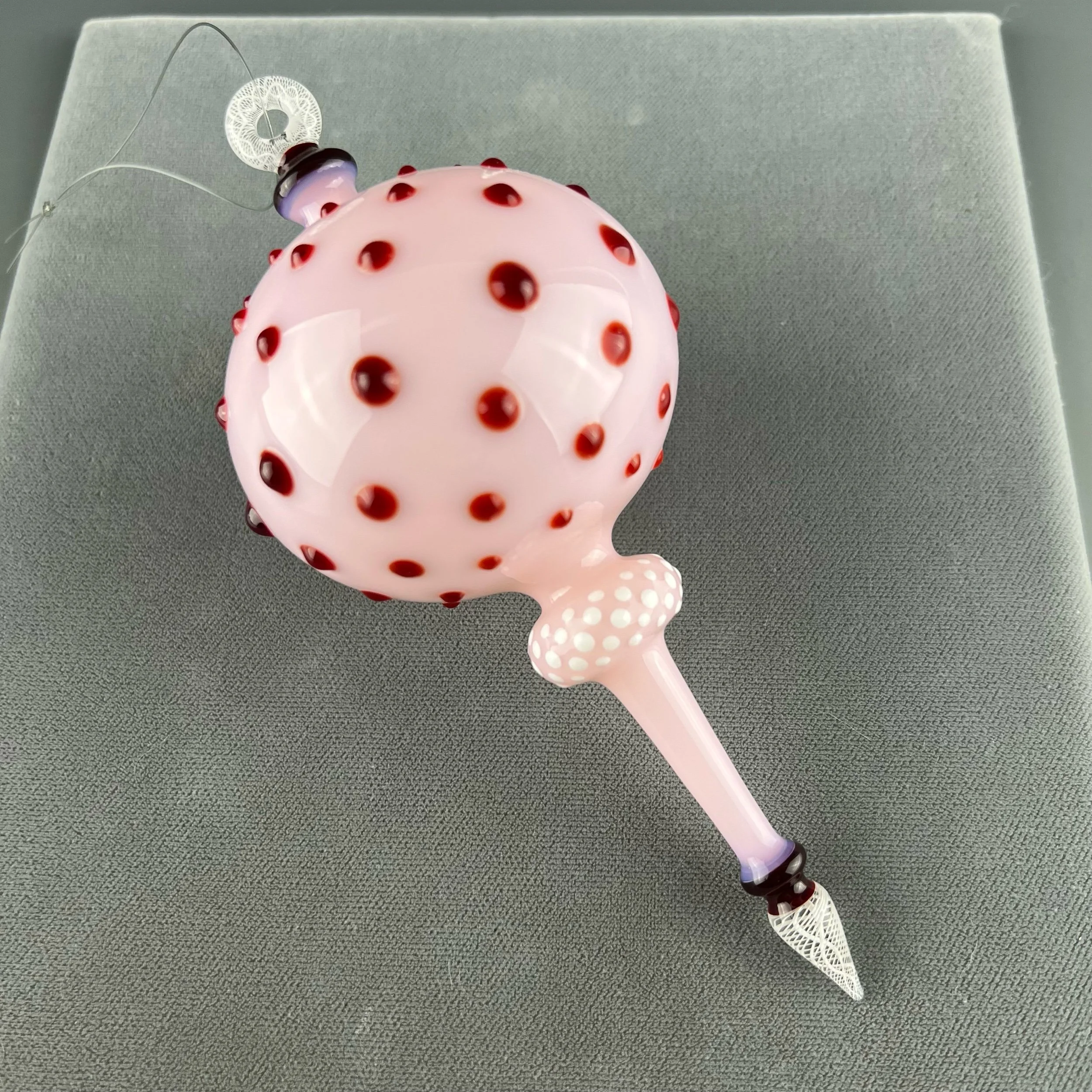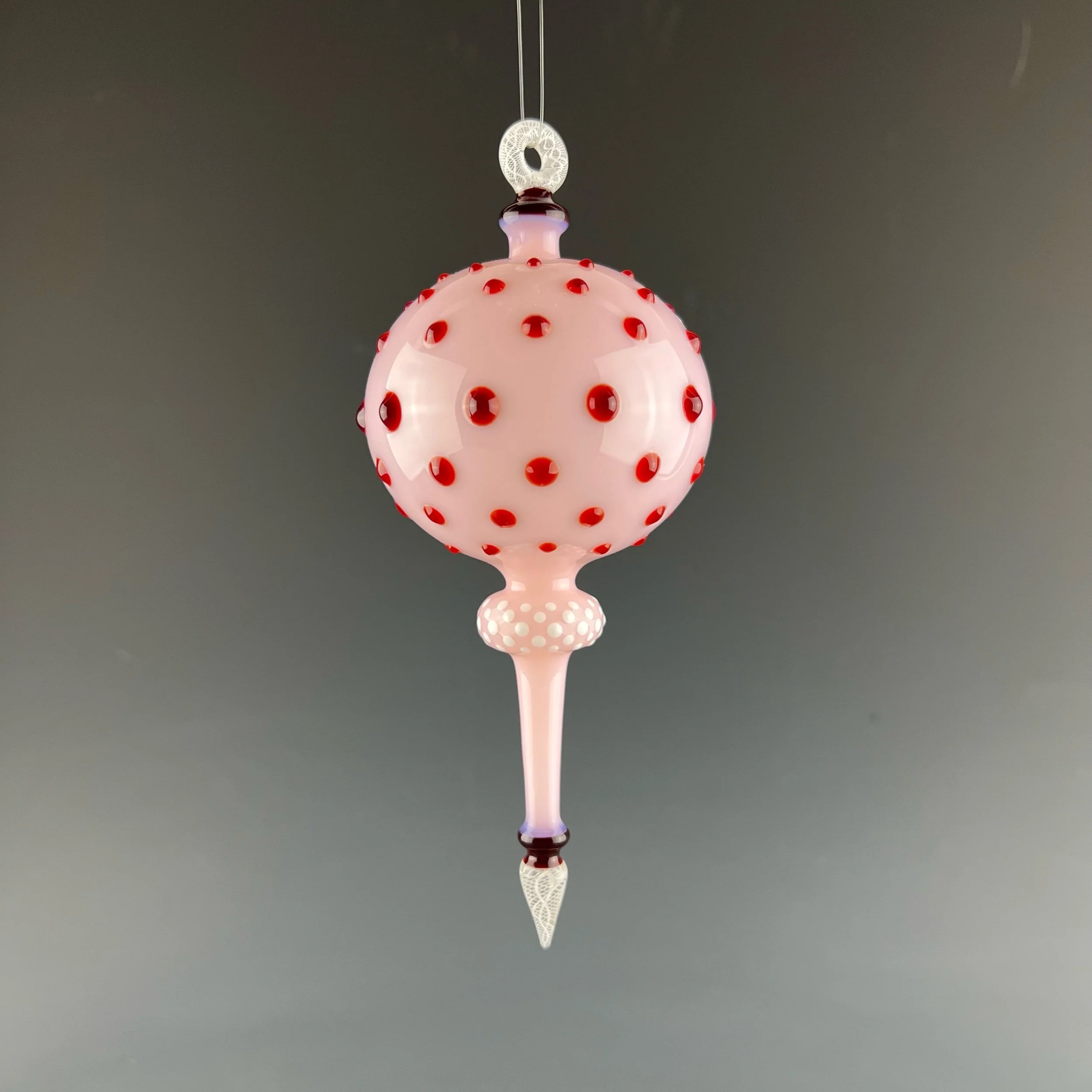 A nice and shapely hanging ornament in pastel pink with ruby red hobnails, white dot pattern with white/clear latticino helix cane elements.